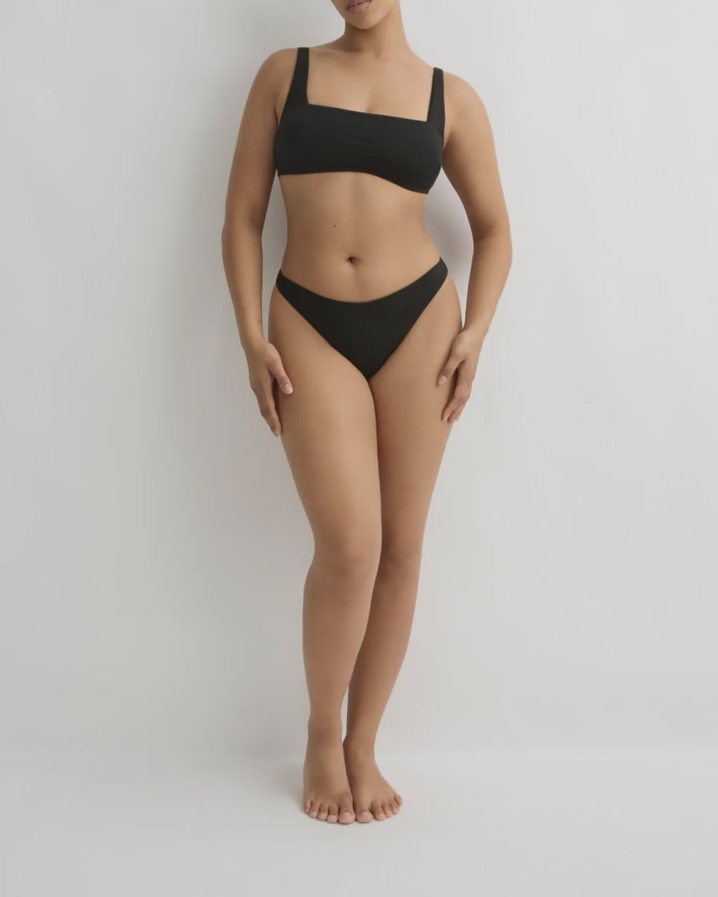 One of our all time best sellers, the Aria Bikini Top in black is an elegant and timeless bralette with a flattering square neckline. Invisible under-bust support and removable cups. Self-lined in our ultra-soft Embodee™ fabric that has high shaping power. Wide shoulder straps with no fastener provides maximum comfort for swimming and lounging. Best suits cup sizes A-D.