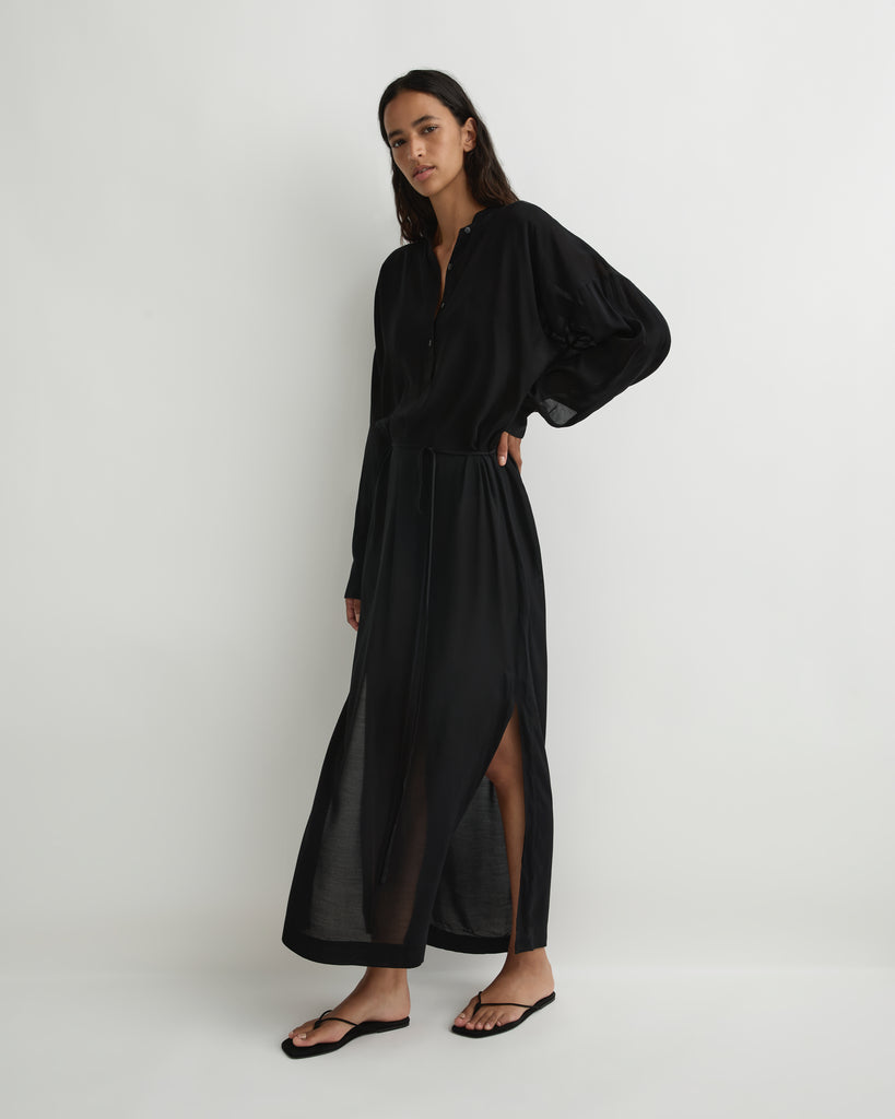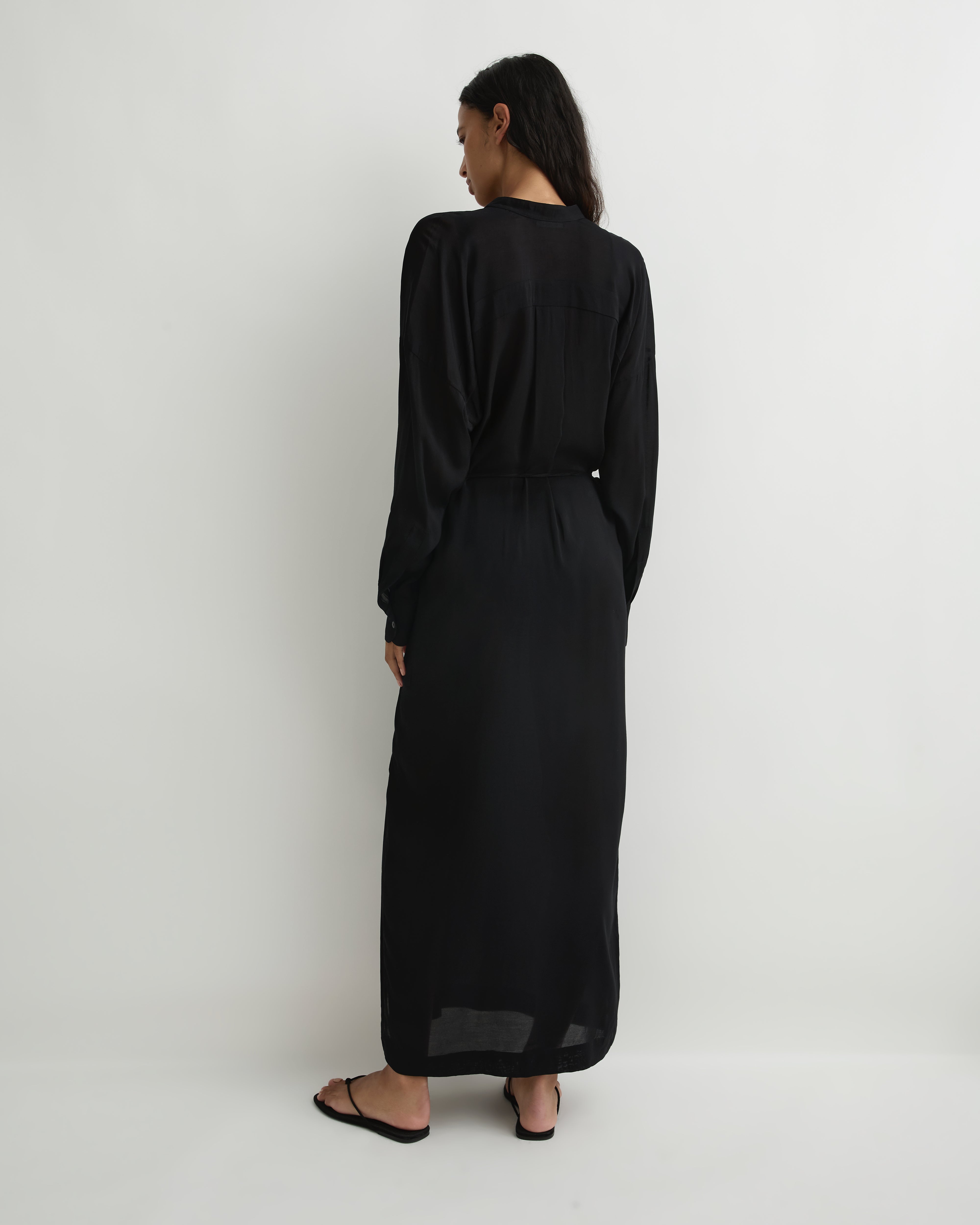 The Cremona Long Tunic Dress in black is an effortlessly elegant cover-up for summer days and evenings. Crafted from soft, sheer rayon voile, this lightweight caftan features a stand collar, button-front detail, and cuffed long sleeves for a refined finish. A waist tie cinches the silhouette, while side splits provide ease of movement. Perfect for transitioning from beach to bar, wear it over swimwear or style it with chic sandals for a sophisticated resort look.