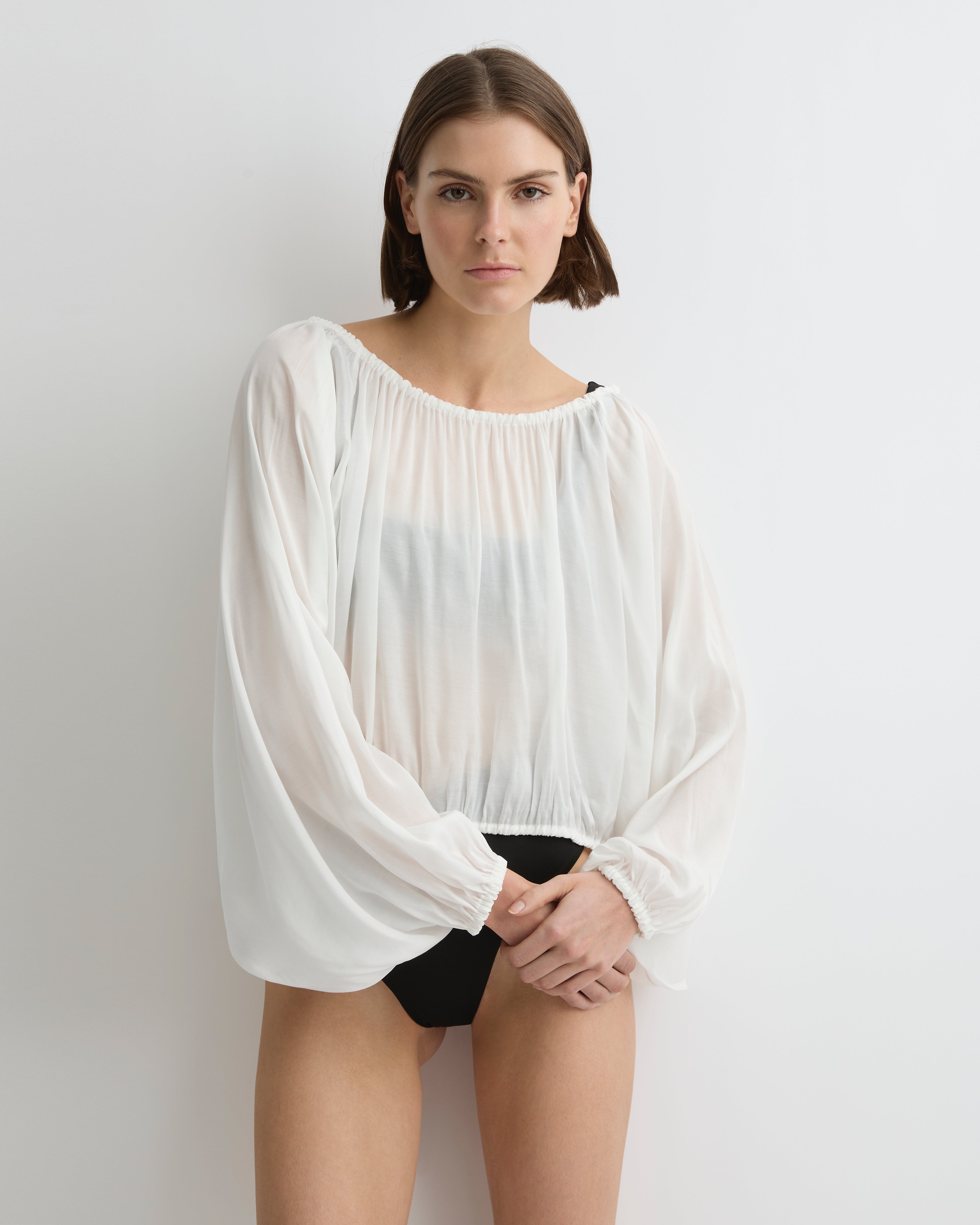 The Cremona Balloon Top in white brings soft volume and contemporary ease to summer styling. Crafted from sheer European voile, its gathered neckline, sleeves and hem create an airy, lightweight silhouette. Cropped and relaxed, it pairs effortlessly with both structured and fluid separates.