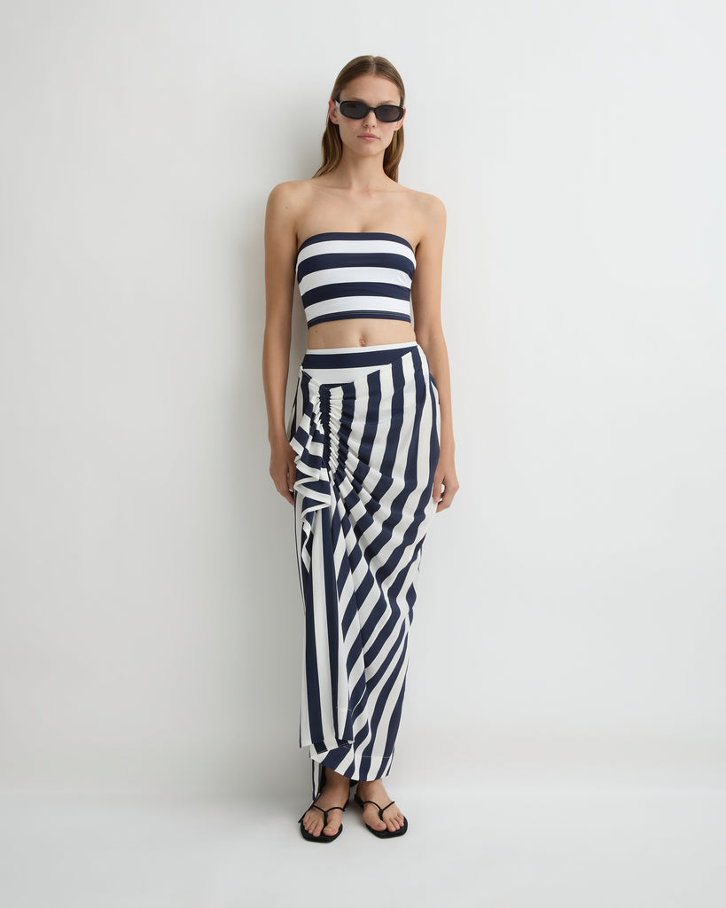 With a refined nautical feel, the Stella Bikini Top in Navy & White Stripe is a strapless bandeau with a fresh, modern edge. Crafted from our luxuriously soft Italian Embodee™ fabric, which is sustainably produced, Stella is self-lined for supreme comfort and gentle shaping power. Invisible under-bust support and subtle side gathering complete the flattering fit. Suits cup sizes A–F. Pairs perfectly with matching swim bottoms or crisp white or navy resort wear.