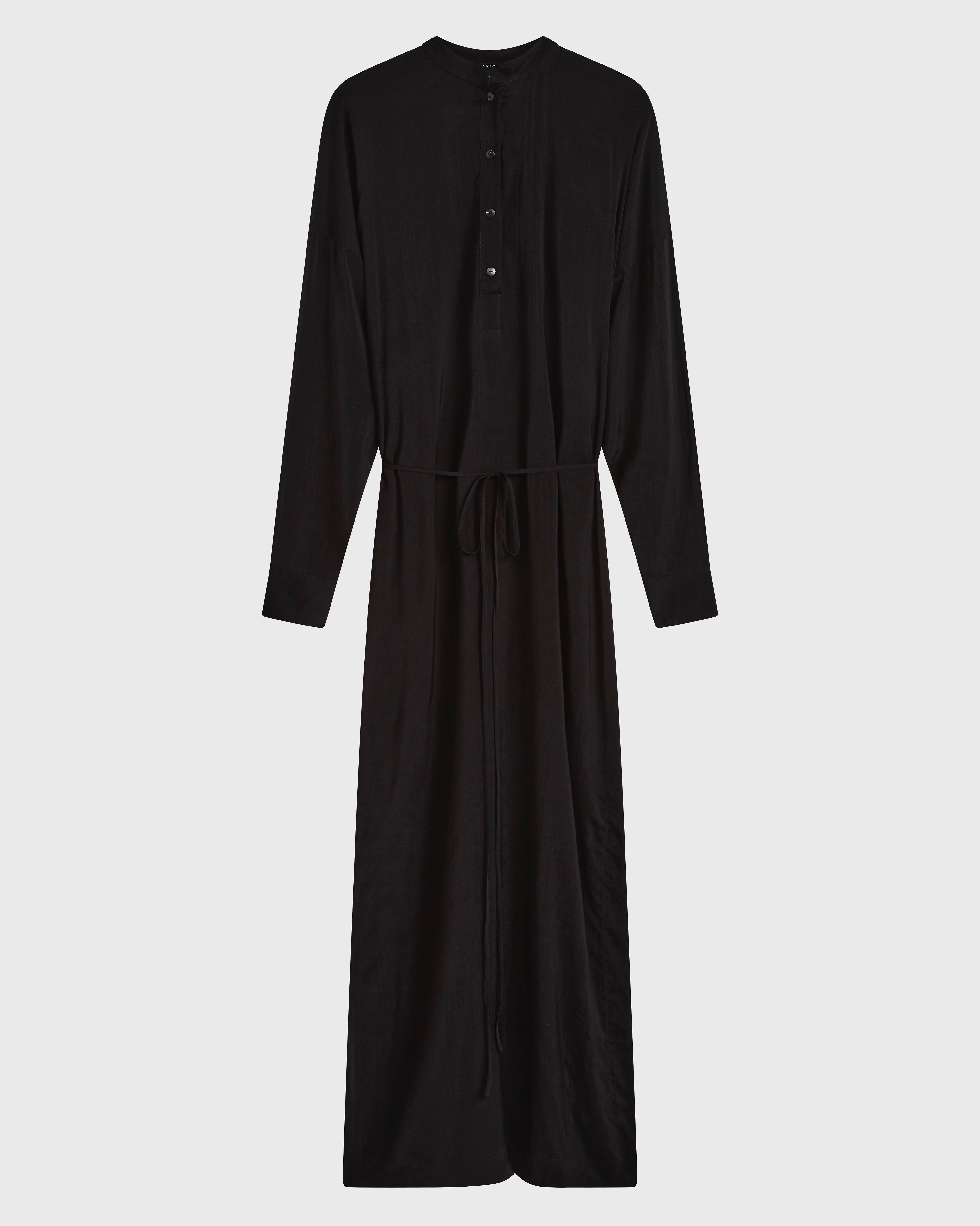 The Cremona Long Tunic Dress in black is an effortlessly elegant cover-up for summer days and evenings. Crafted from soft, sheer rayon voile, this lightweight caftan features a stand collar, button-front detail, and cuffed long sleeves for a refined finish. A waist tie cinches the silhouette, while side splits provide ease of movement. Perfect for transitioning from beach to bar, wear it over swimwear or style it with chic sandals for a sophisticated resort look.