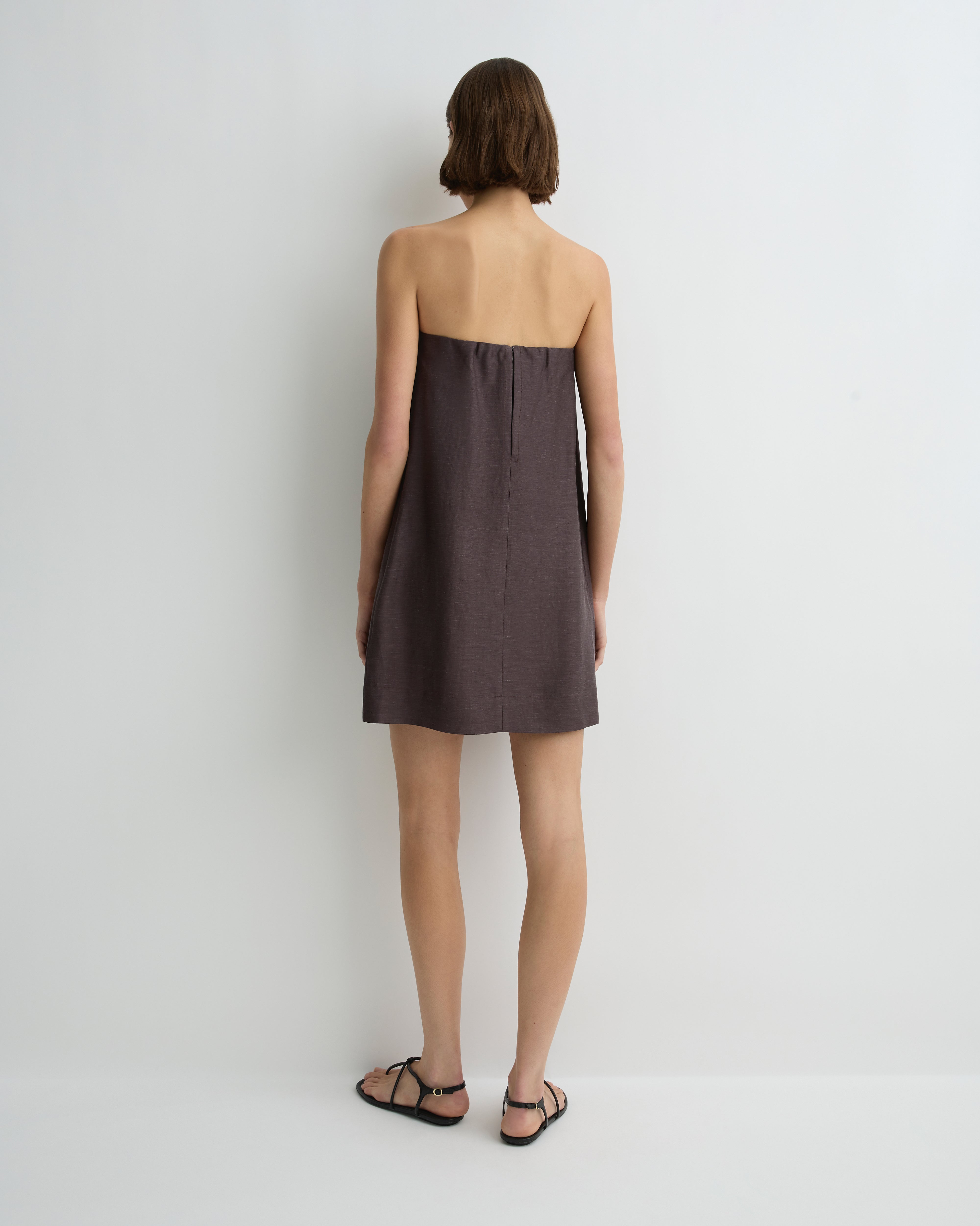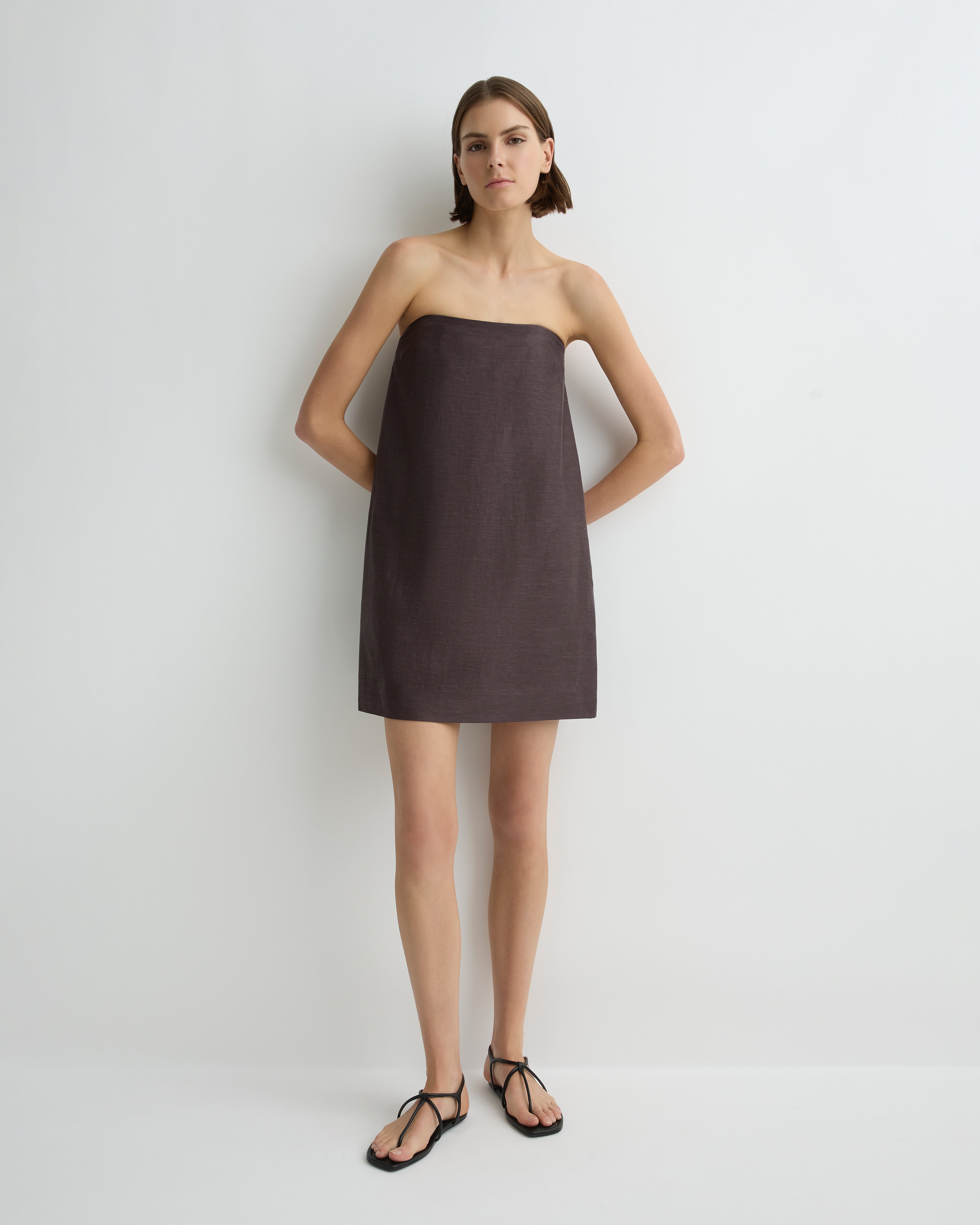The limited-edition Bormio Strapless Mini Dress in mocha delivers modern minimalism with a structured edge. Its internal boned bodice ensures a secure and sculpted fit, balanced by the soft drape of European linen blend. Finished with side pockets and clean lines, it’s the perfect blend of confidence and ease.