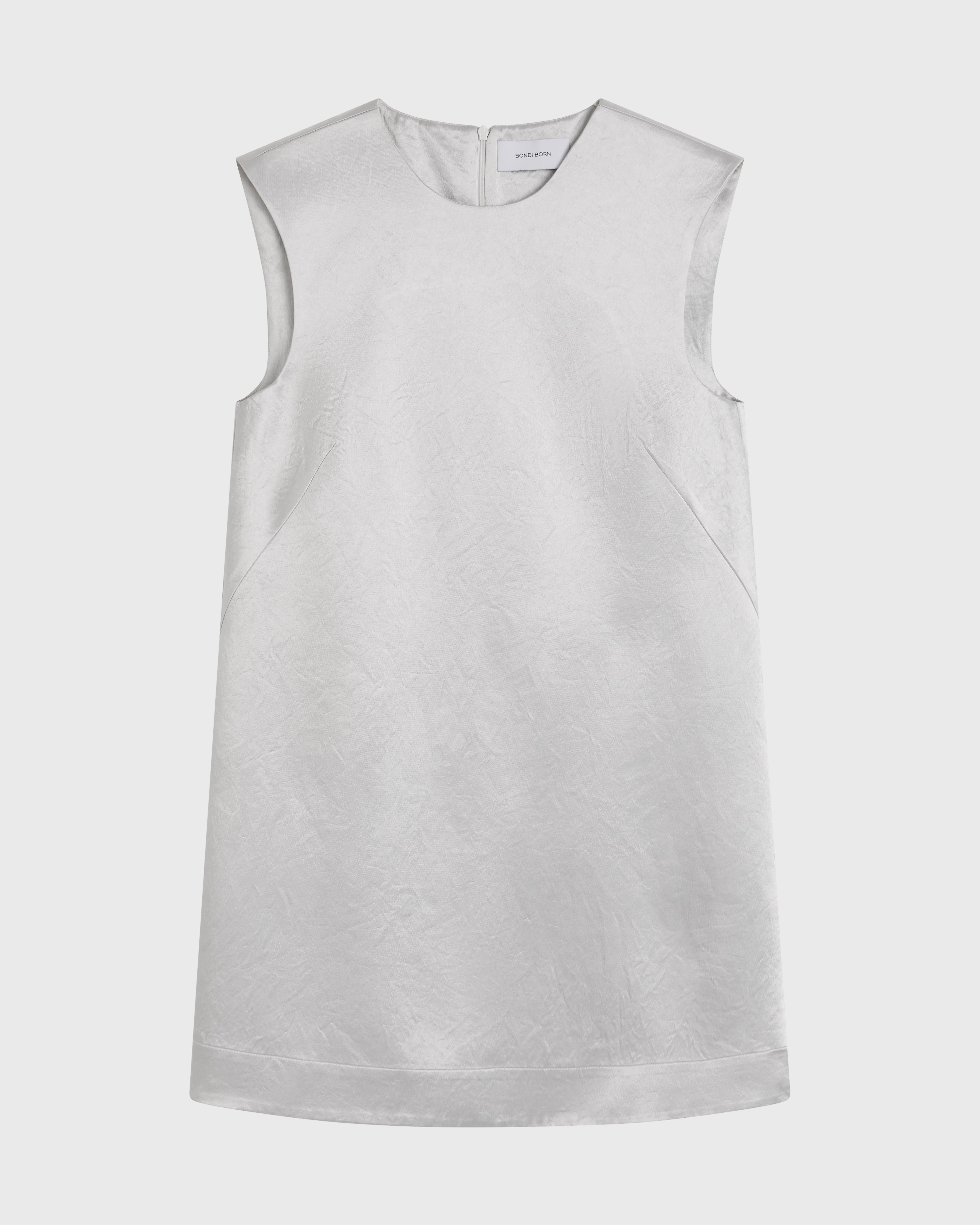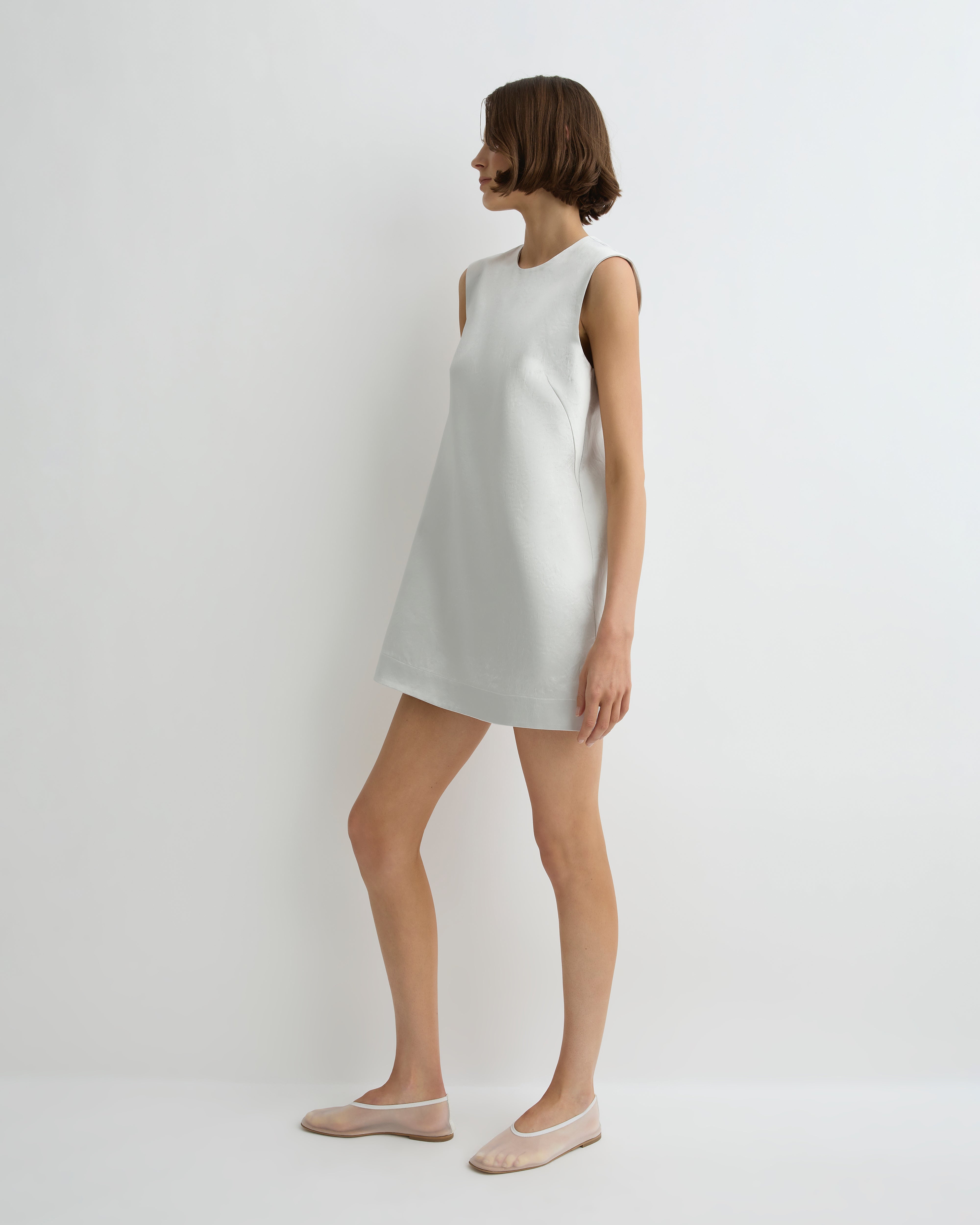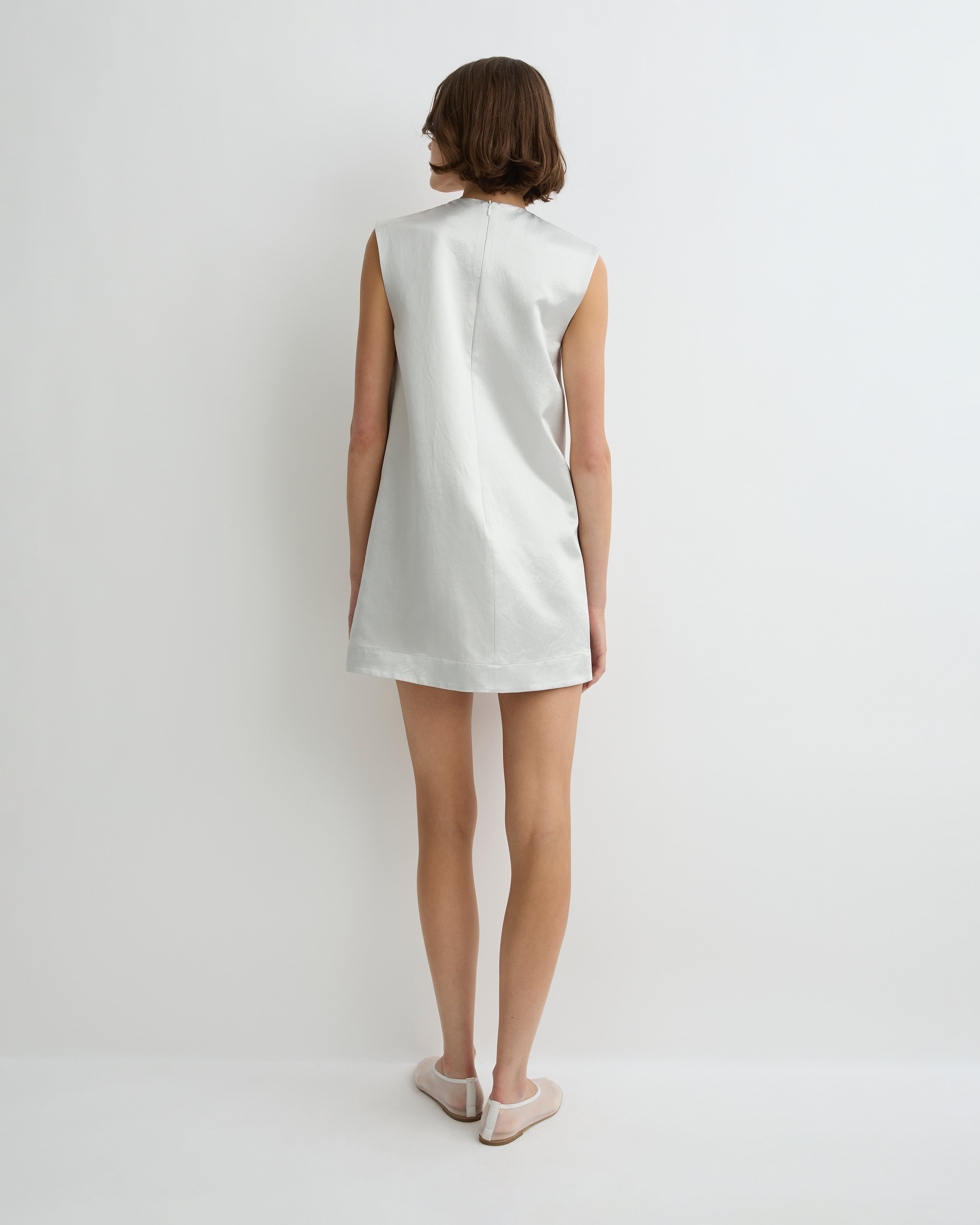 A modern classic, the limited-edition Kobe Mini Shift Dress in platinum is crafted from Japanese Acetate Satin for a soft sheen and elegant movement. Its clean shift shape, high neckline and mini length create a fresh, polished silhouette suitable for day or evening.