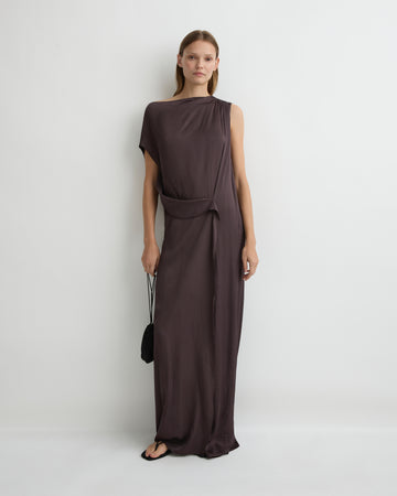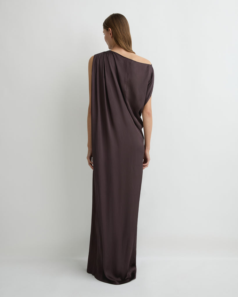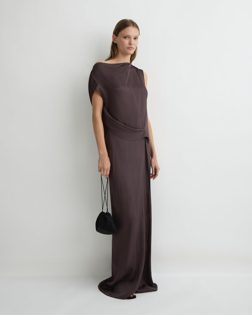 An elegant option for any special occasion, the Ardea Draped Dress is rich Mocha is cut from a luxe, fluid viscose blend with a hammered satin finish chosen for its elegant drape. This statement column dress can be worn on or off the shoulder and features flattering draping at the shoulder and waist with a front split.