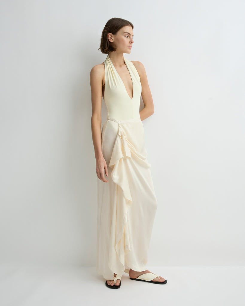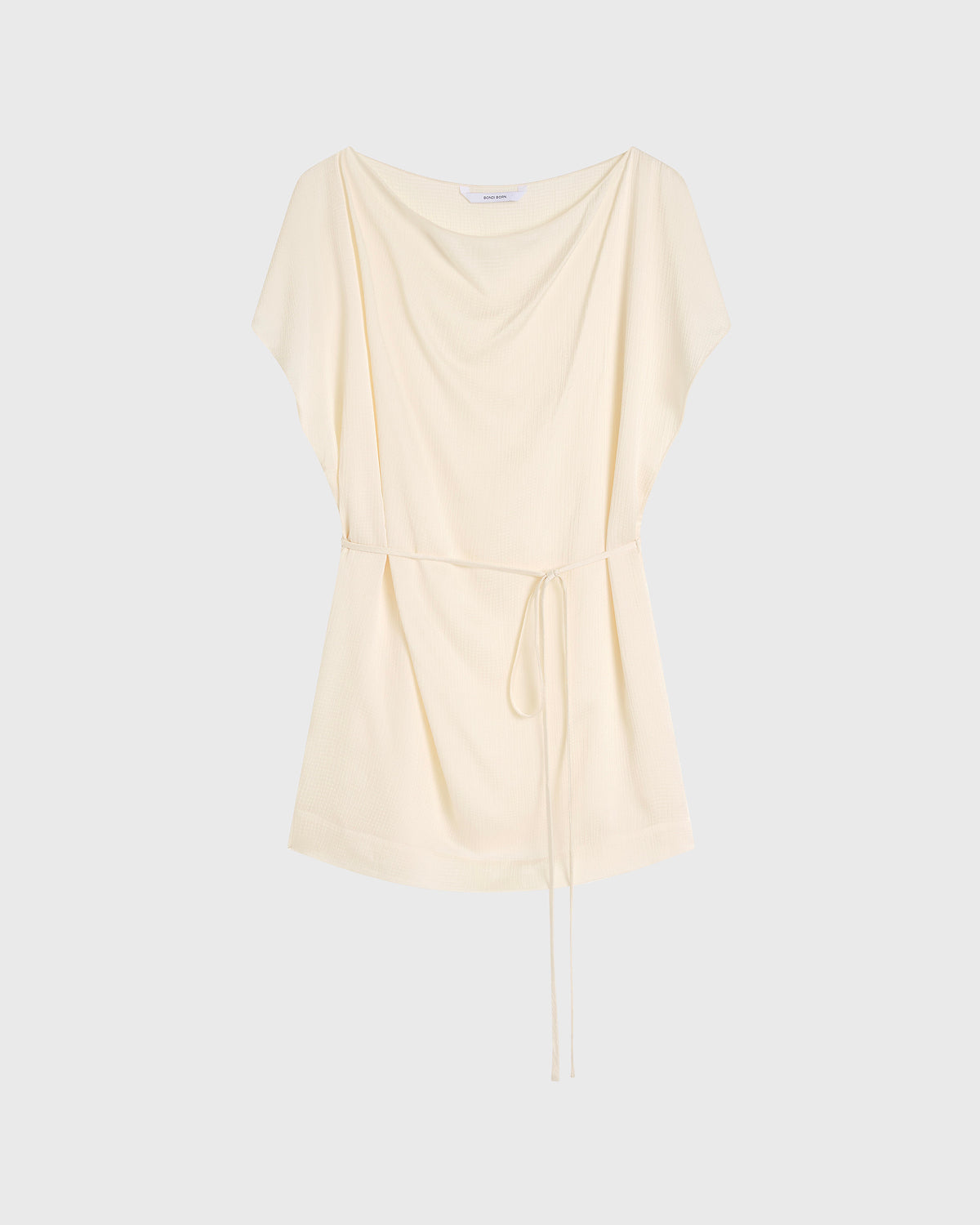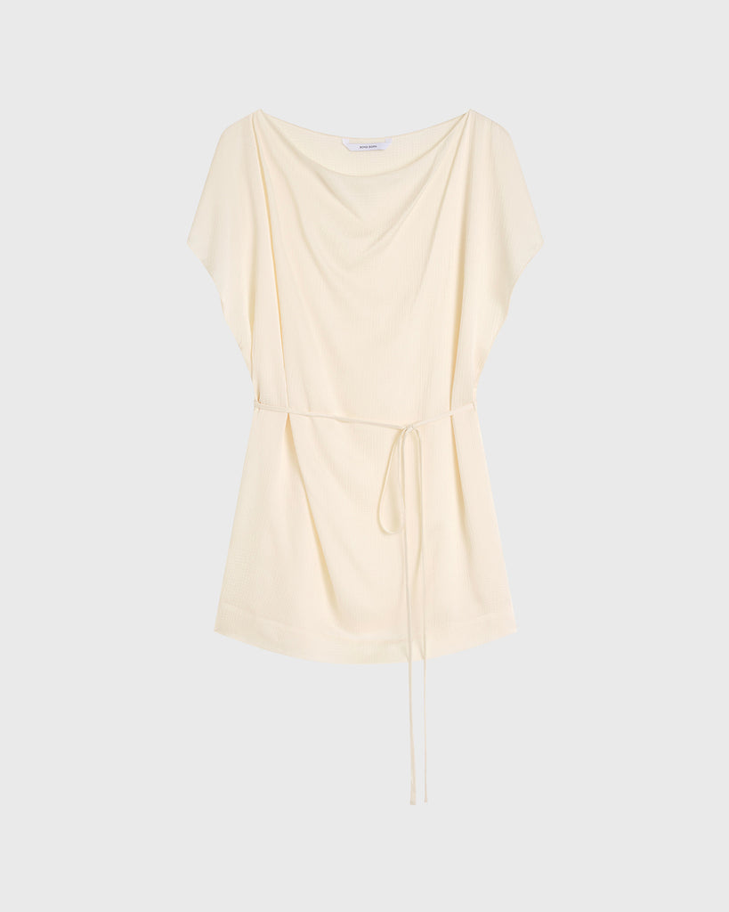 The Ardea Split Shoulder Top in Pearl is crafted from our luxurious european-made hammered satin, loved for its cool hand-feel and fluid drape. Defined by its cowl front neck, draped sleeve and open shoulder detail, its silhouette fits relaxed against the body, pulled together with its self-waist tie. Moving fluidly with the body, this chic piece offers understated sophistication for elevated event dressing or special evenings, paired back perfectly with our Ardea Luxe Pant.