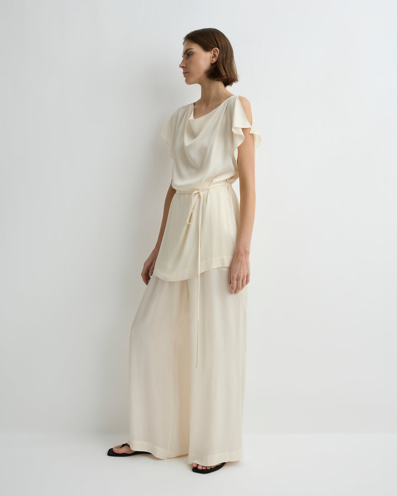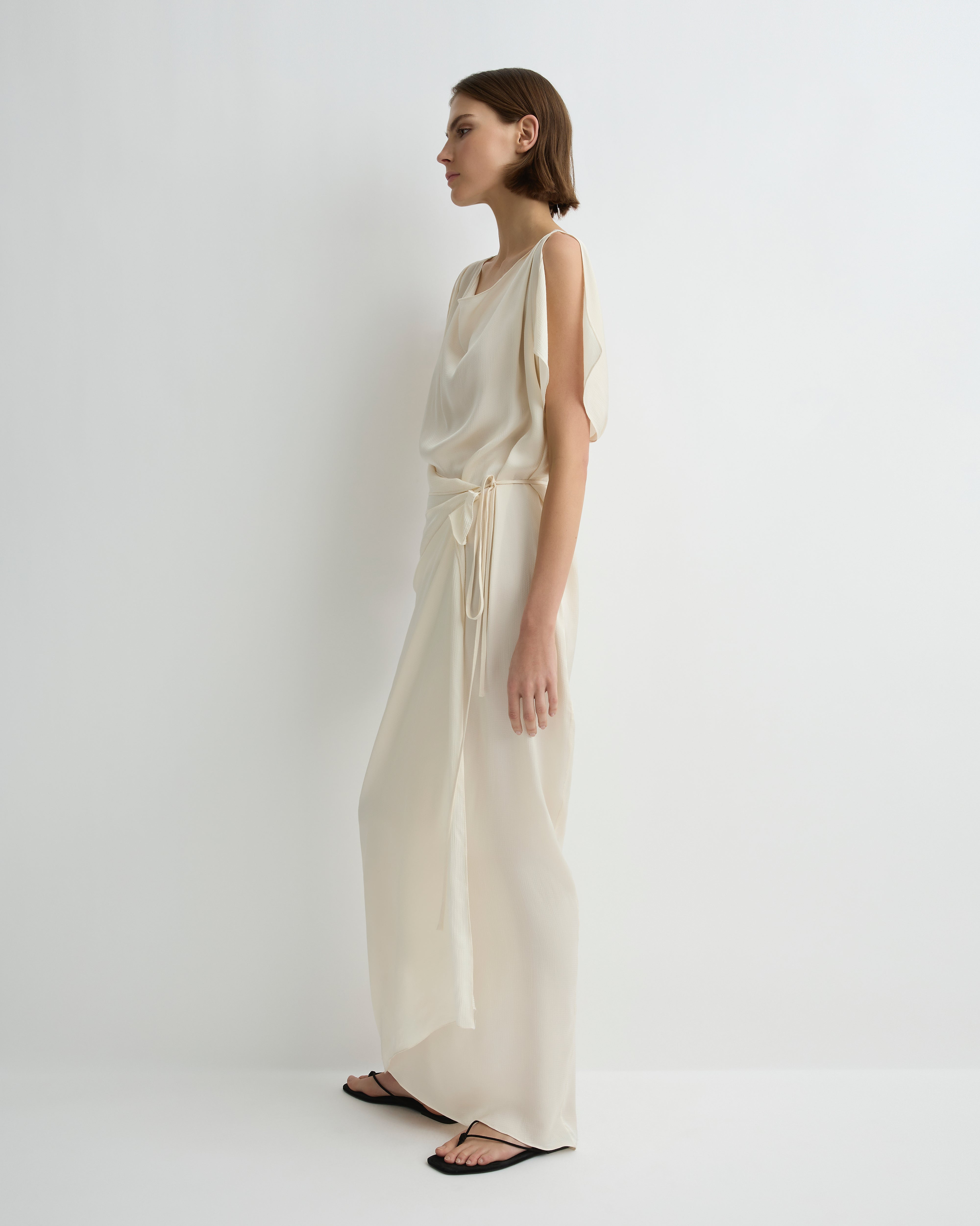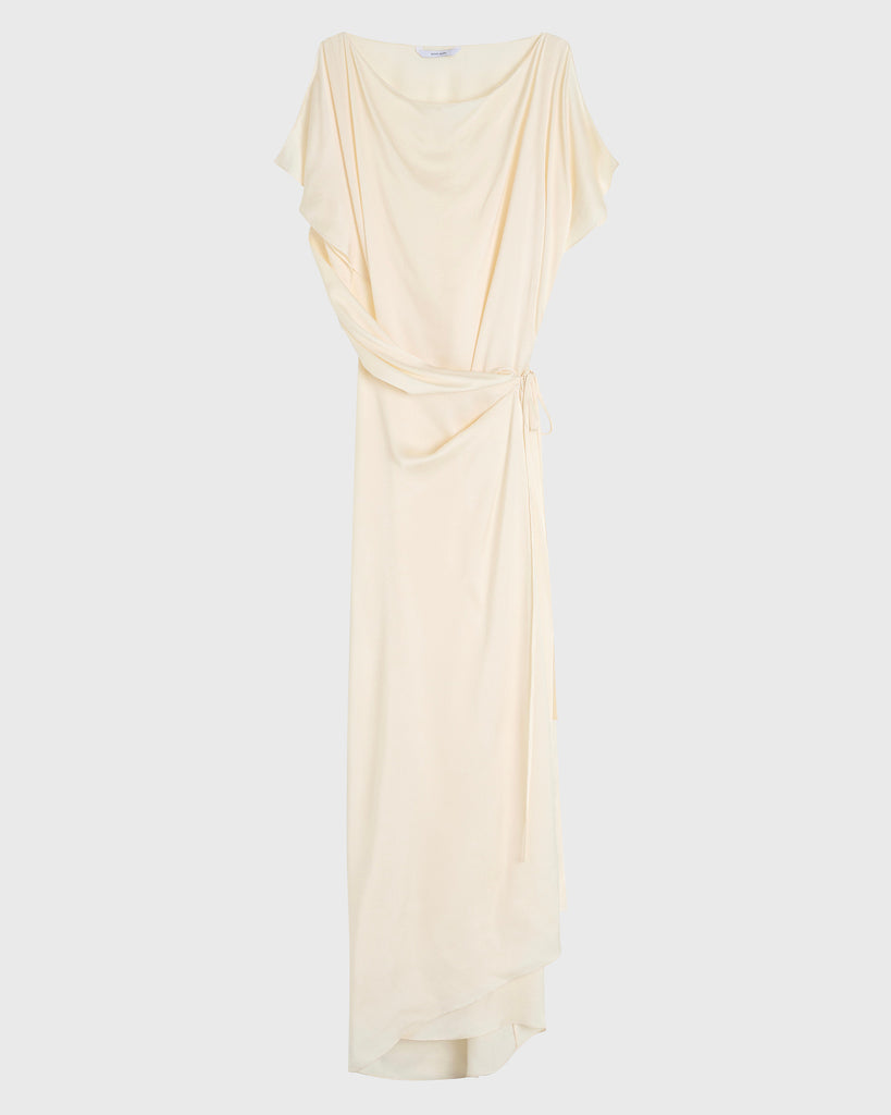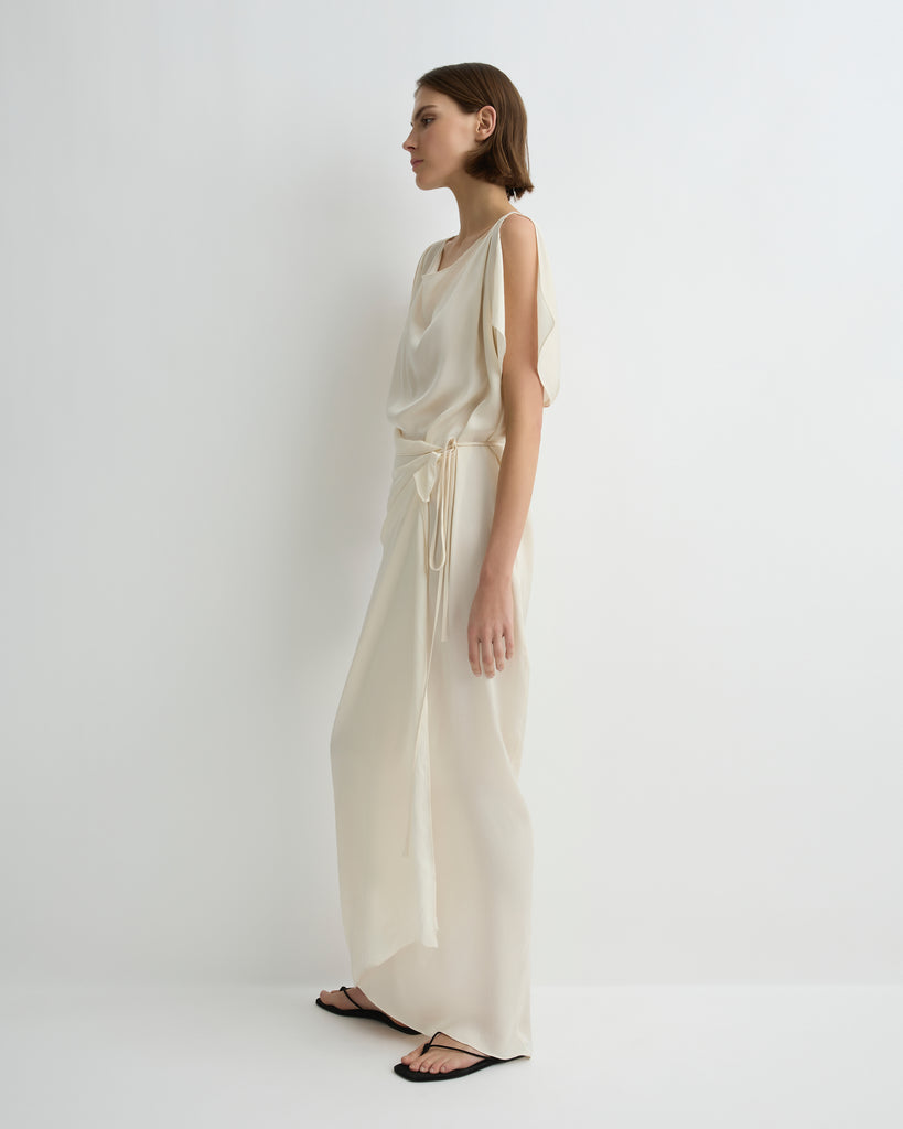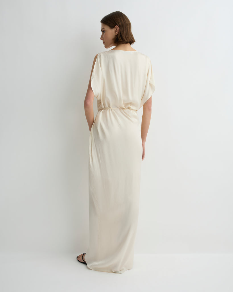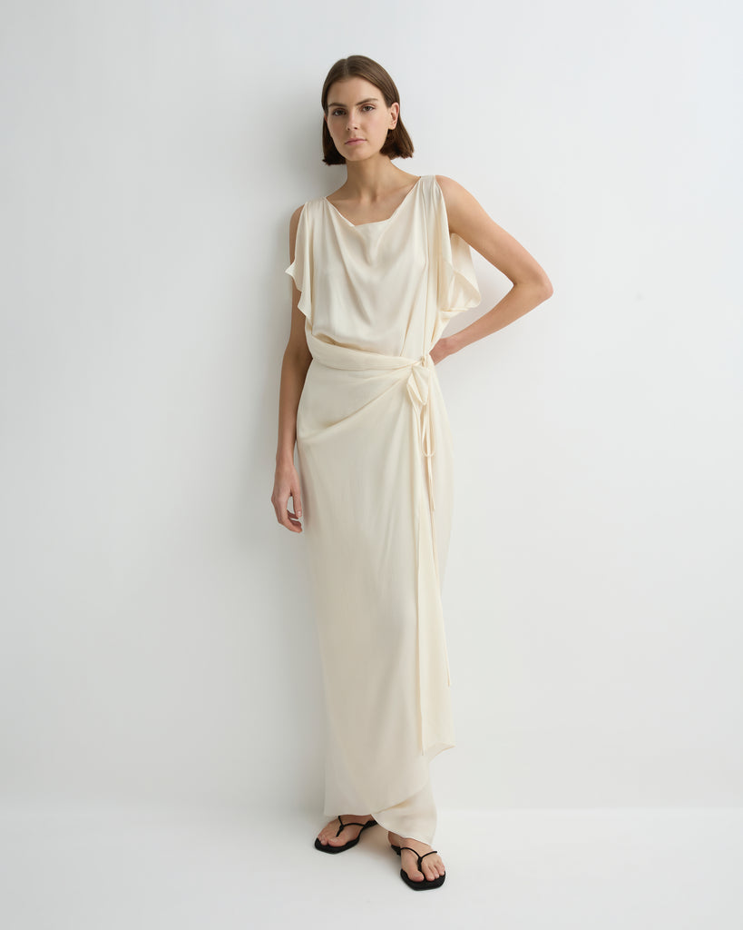 An elegant option for any special occasion, the Ardea Wrap Dress in Pearl is crafted from a fluid viscose blend with a luxurious hammered satin finish, chosen for its elegant draped silhouette. Moving effortlessly with the body, this dress features a cowl neck and open shoulder detail, exuding understated sophistication for event dressing or elevated evenings.