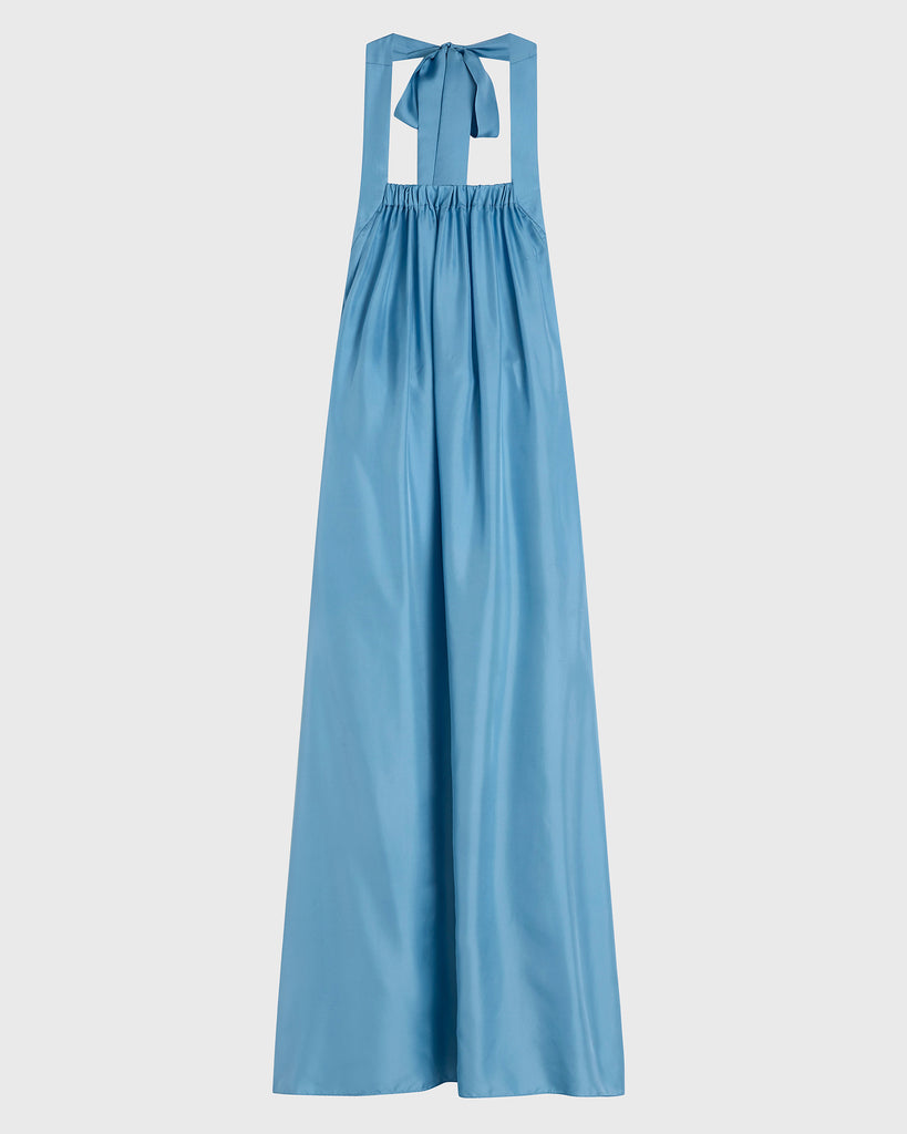 The Marfa Silk Halter Maxi Dress in Dusk is a statement silhouette, cut from 100% silk twill with a soft, fluid drape. Designed with a halter tie neck, elasticated neckline and backline, this voluminous maxi flows effortlessly with the body. Loose in fit yet bold in presence, it is perfect for weddings, parties and elevated summer soirées.