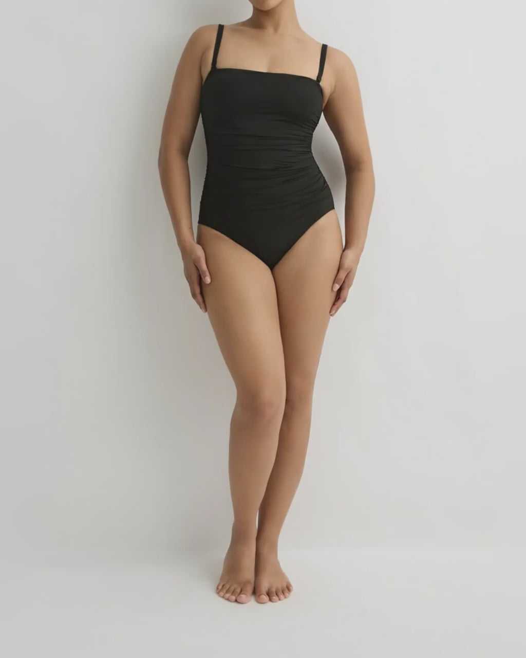The Raya Bandeau One Piece in Black is a timeless swimwear silhouette designed for both comfort and confidence. Crafted from our ultra soft, Italian Embodee™ fabric with gentle shaping power, Raya features gathers across the stomach to flatter the silhouette. Invisible under bust support and detachable straps offer versatile styling. Ideal for larger bust sizes from C to F, Raya is a timeless piece for your summer wardrobe. This sustainably produced luxury fabric will last up to ten times longer than standard swim fabrics.