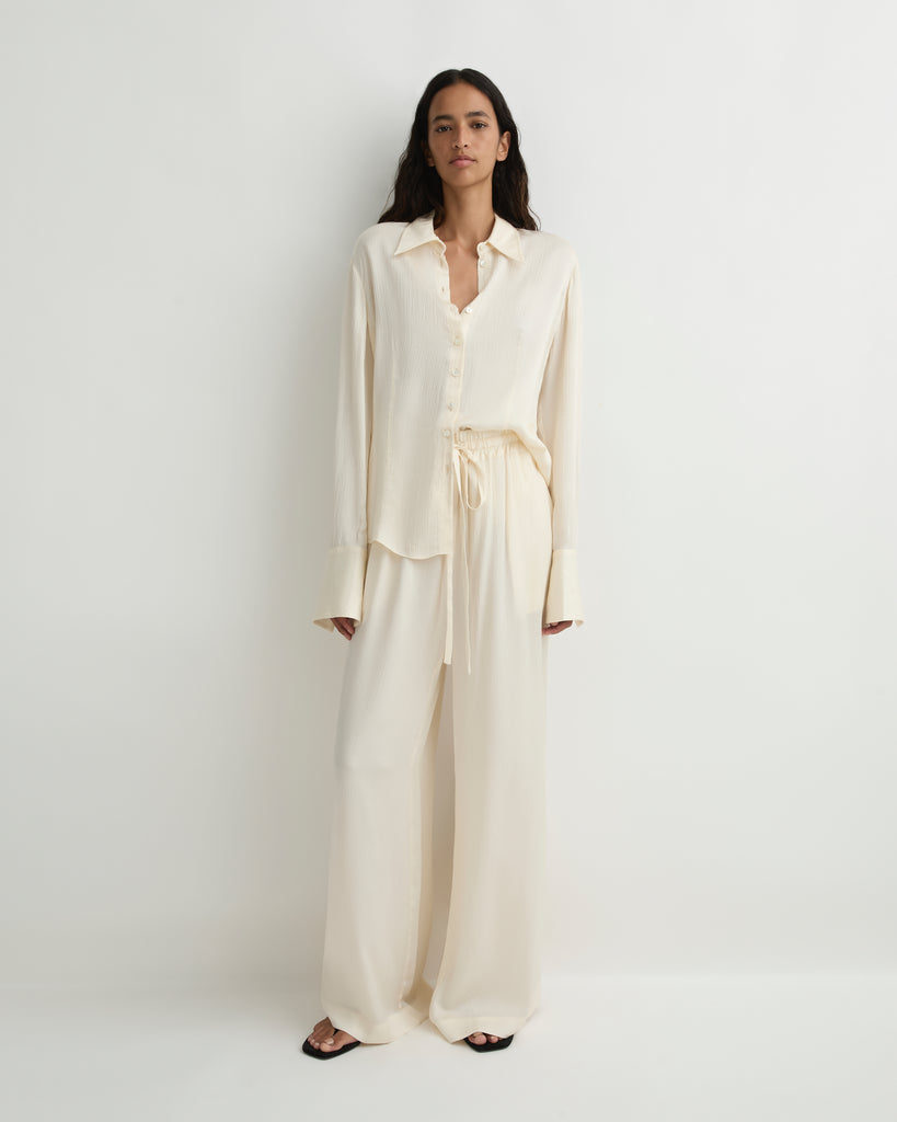 Effortlessly refined, the Ardea Luxe Pant in Pearl is cut from a fluid viscose blend with a luminous European hammered satin finish. Designed with a wide elasticated waistband and self-tie detail, this relaxed silhouette flows into a wide leg that moves gracefully with the body. Side seam pockets lend ease and versatility, while its draped leg balances comfort and polish.