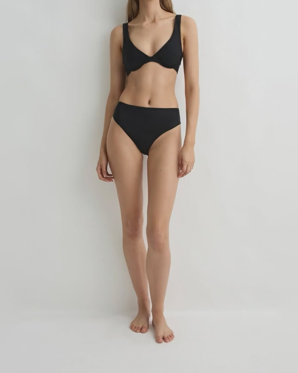 The Fern Bikini Bottom in Black finishes at the waist and has regular bottom coverage. Fern has a higher cut leg-line than best-seller Faith and is crafted from our luxury, technically advanced Sculpteur® fabric that is sustainably made in Italy. Sculpteur® is engineered to smooth the silhouette and lasts up to 10 times longer than standard swim fabrics. Fern is self-lined with a lighter, luxuriously soft version of Sculpteur® for weightless comfort, making it as enduring as it is flattering.