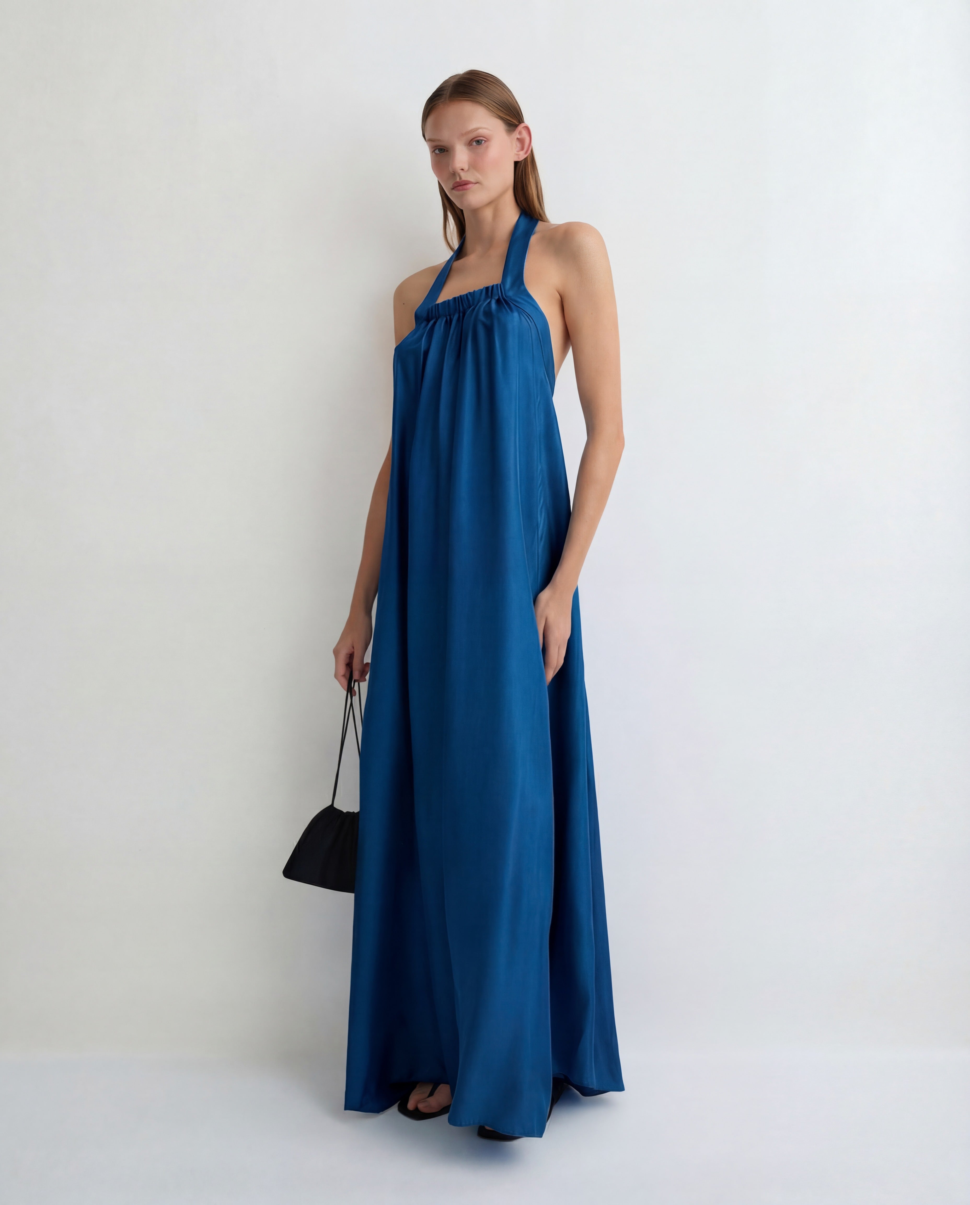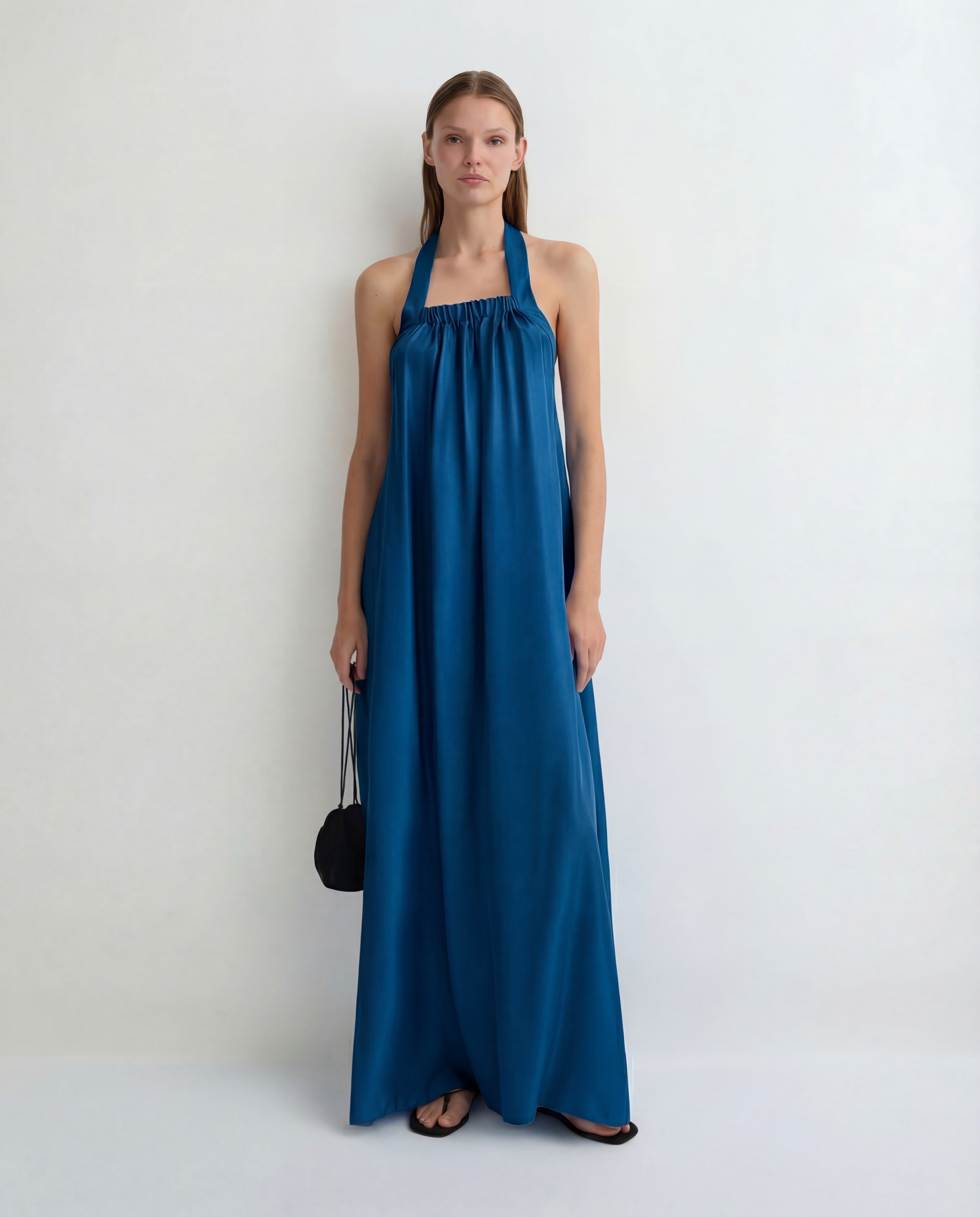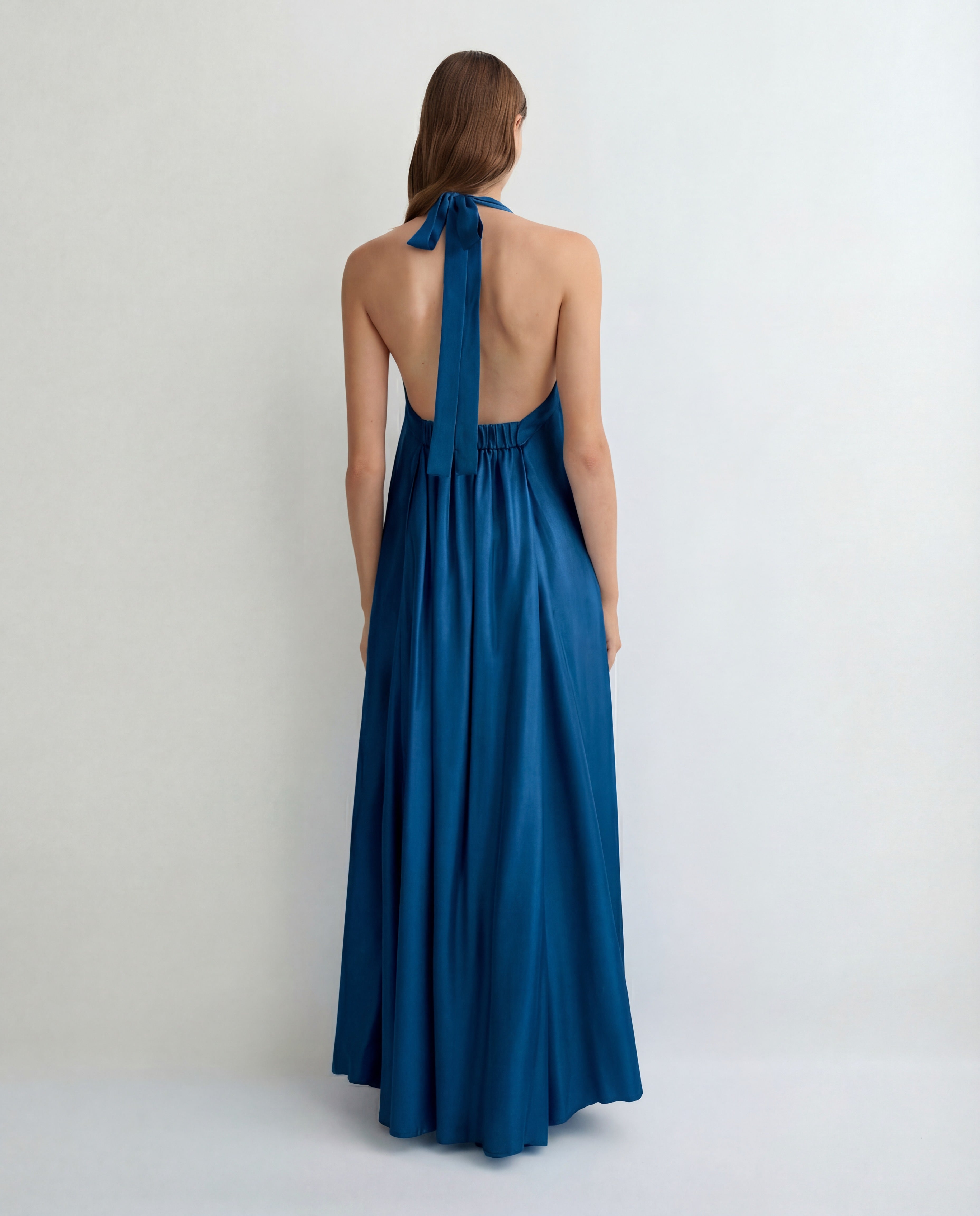 The Marfa Halter Maxi Dress in rich Tropico blue is cut from a luxuriously soft 100% silk twill. This effortlessly chic long dress has a long self tie that fastens behind the neck and an encased elastic at the neckline and on the low scooped back to optimise fit. A statement dress with a full skirt that falls to the floor, perfect for special evenings out or for daytime event dressing to weddings and parties.