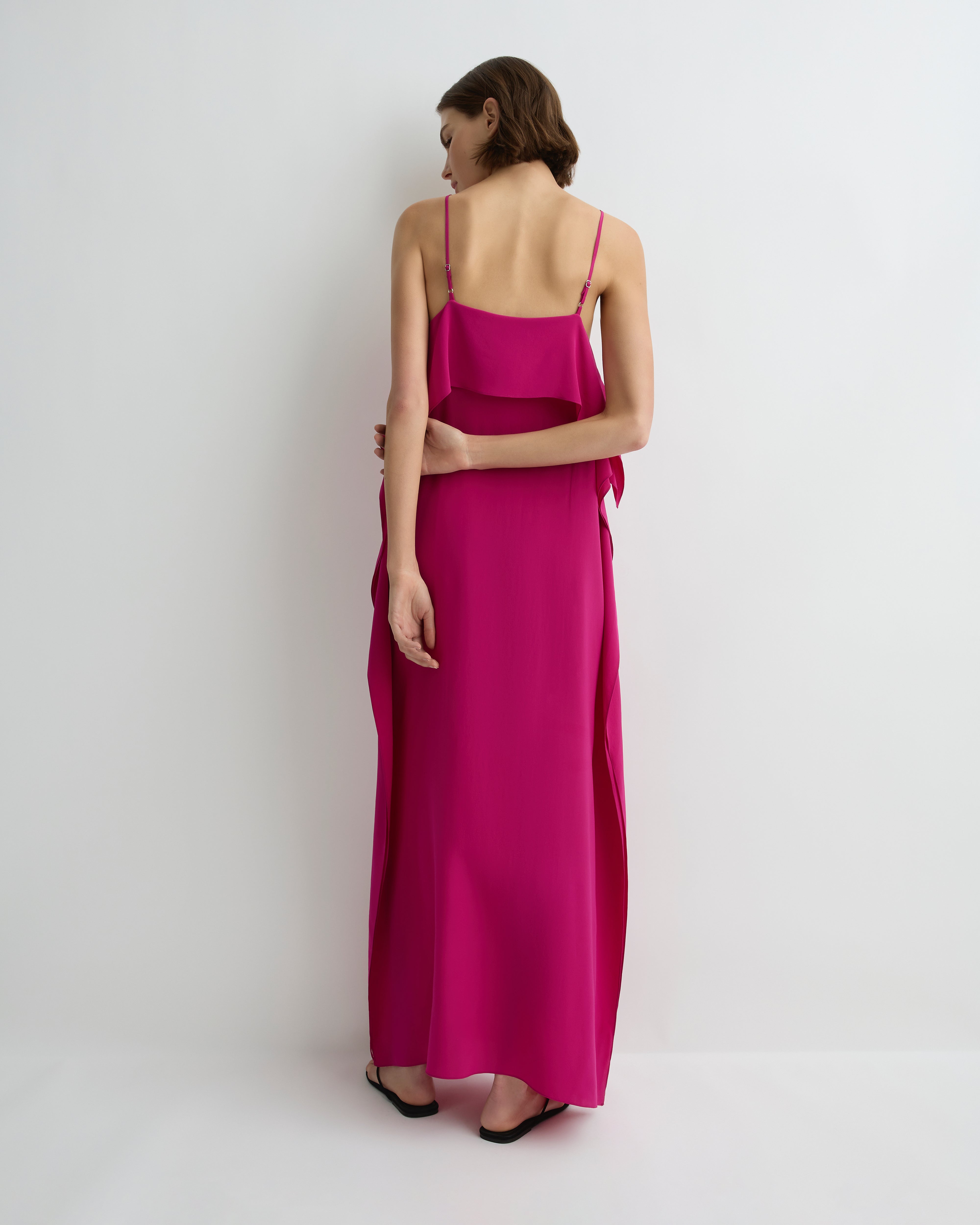The limited-edition Orta Silk Ruffle Slip Dress in bold magenta delivers romantic movement in lustrous Silk Crêpe de Chine. A straight neckline, delicate ruffle detailing and fine rouleau straps create soft femininity, while side splits and an ankle-length silhouette add modern ease.