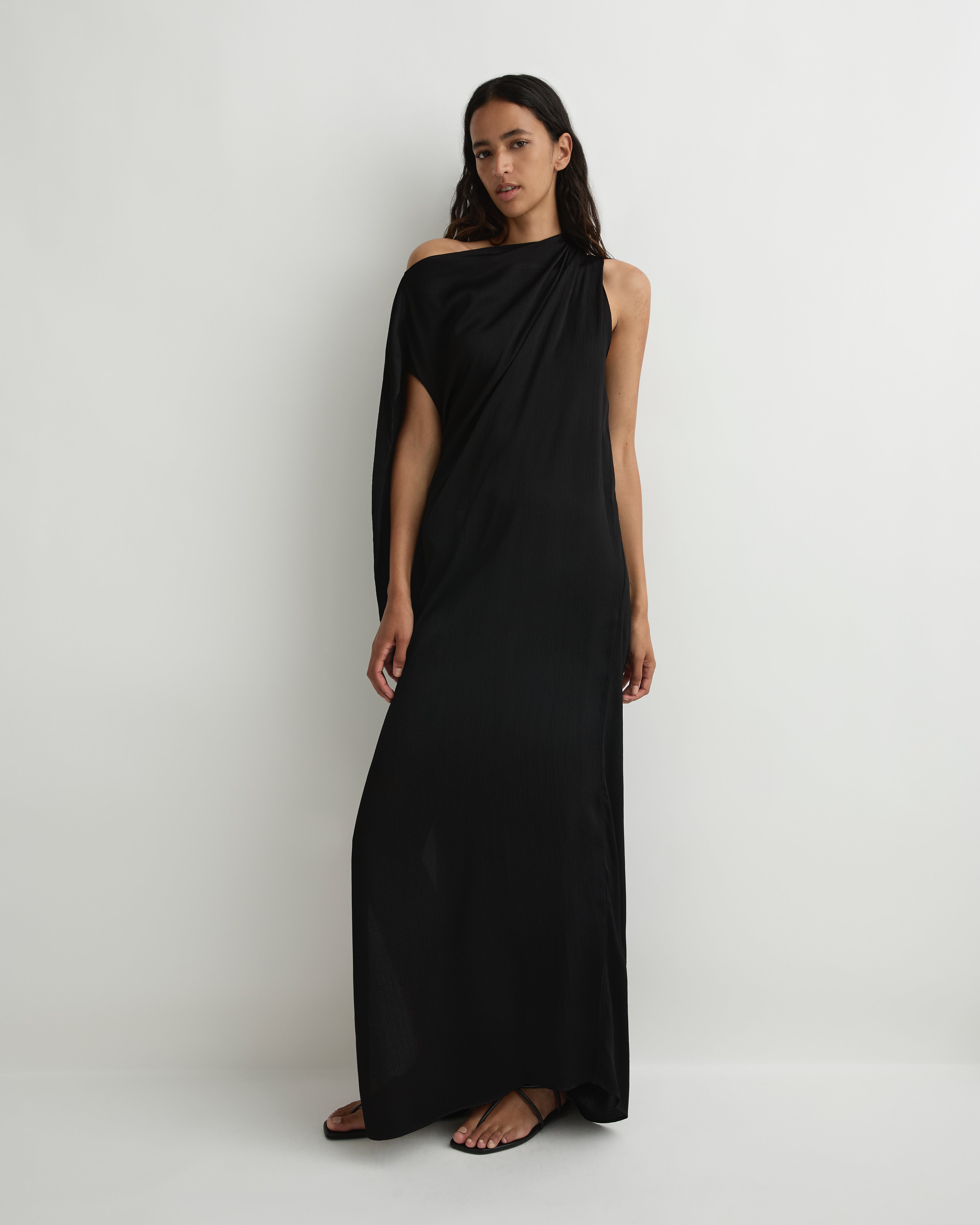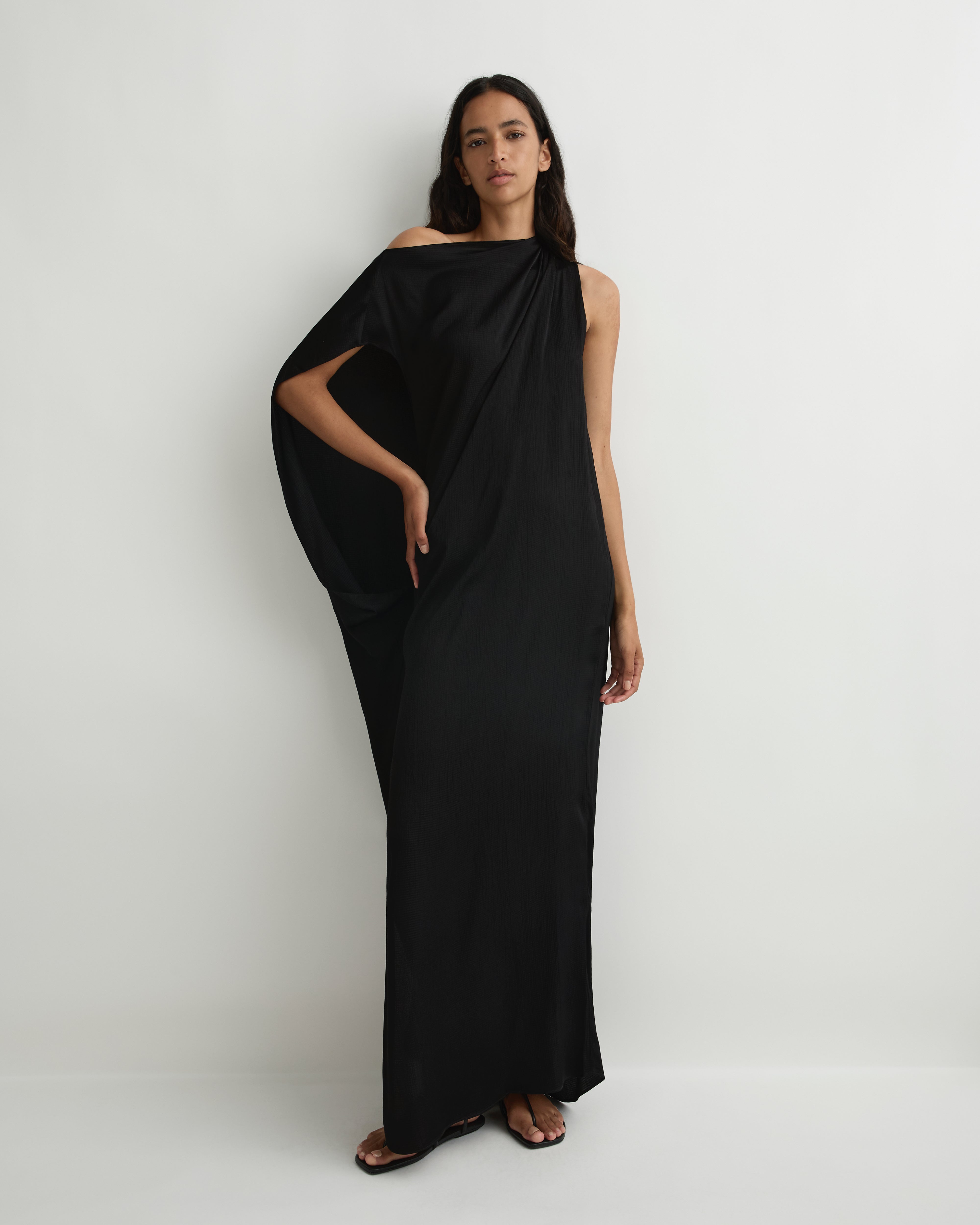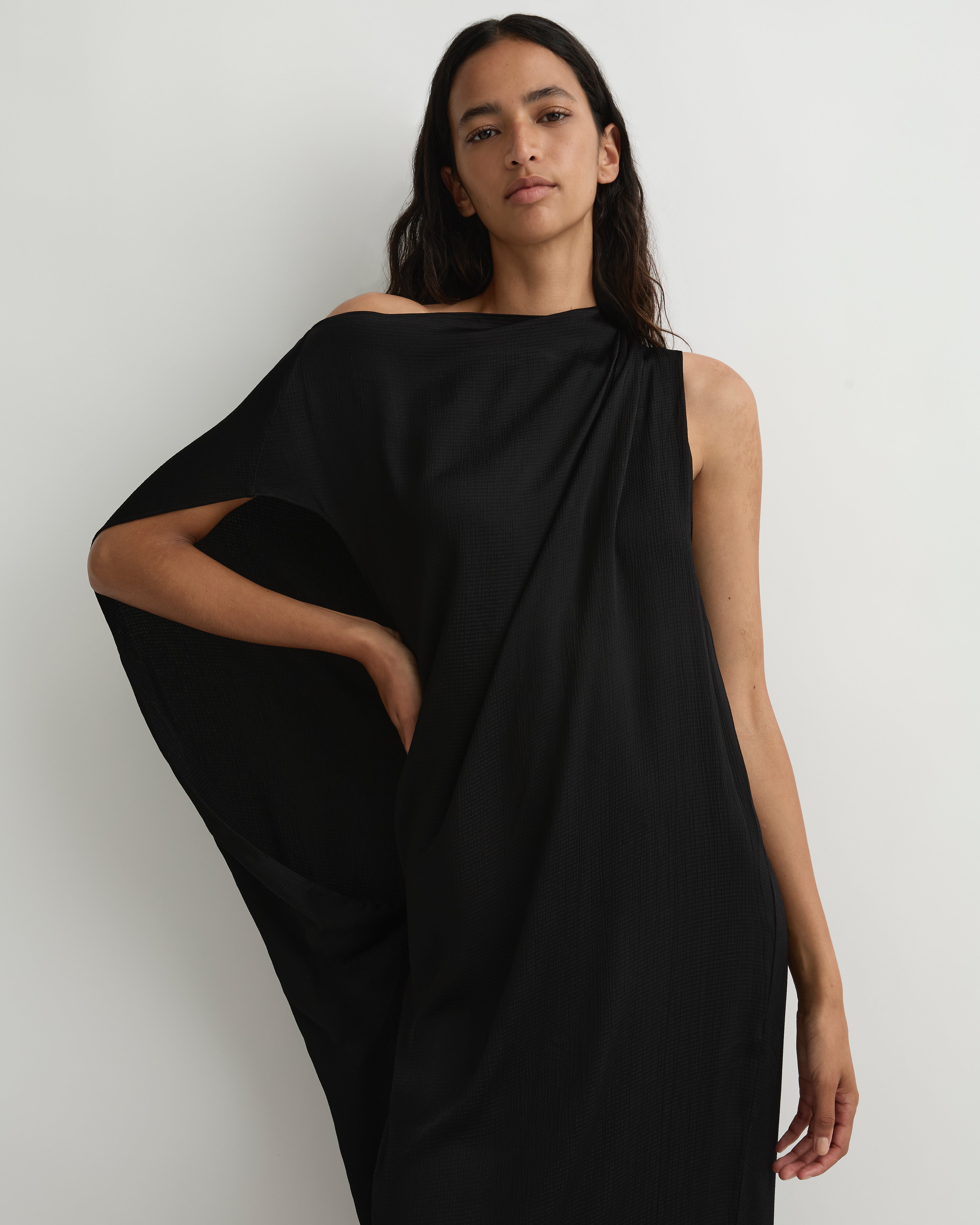 Cut from luxurious European Hammered Satin, the Ardea Asymmetric Maxi Dress in black brings sculptural elegance to warm-weather dressing. Its wide high neckline, asymmetric shoulder tucks and draped armhole create effortless movement and a modern, fluid silhouette. Relaxed through the body with a full-length fall, this piece embodies understated glamour.