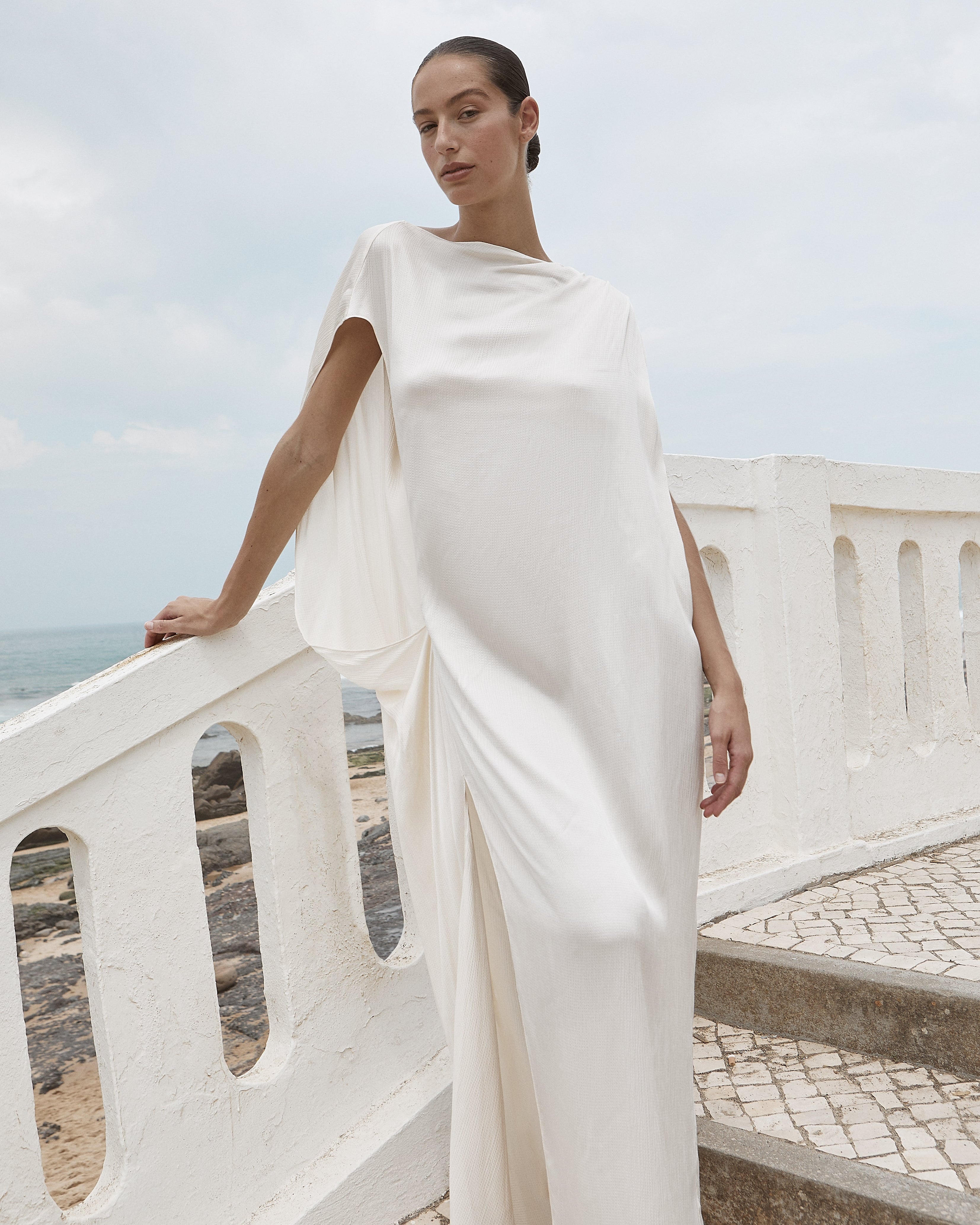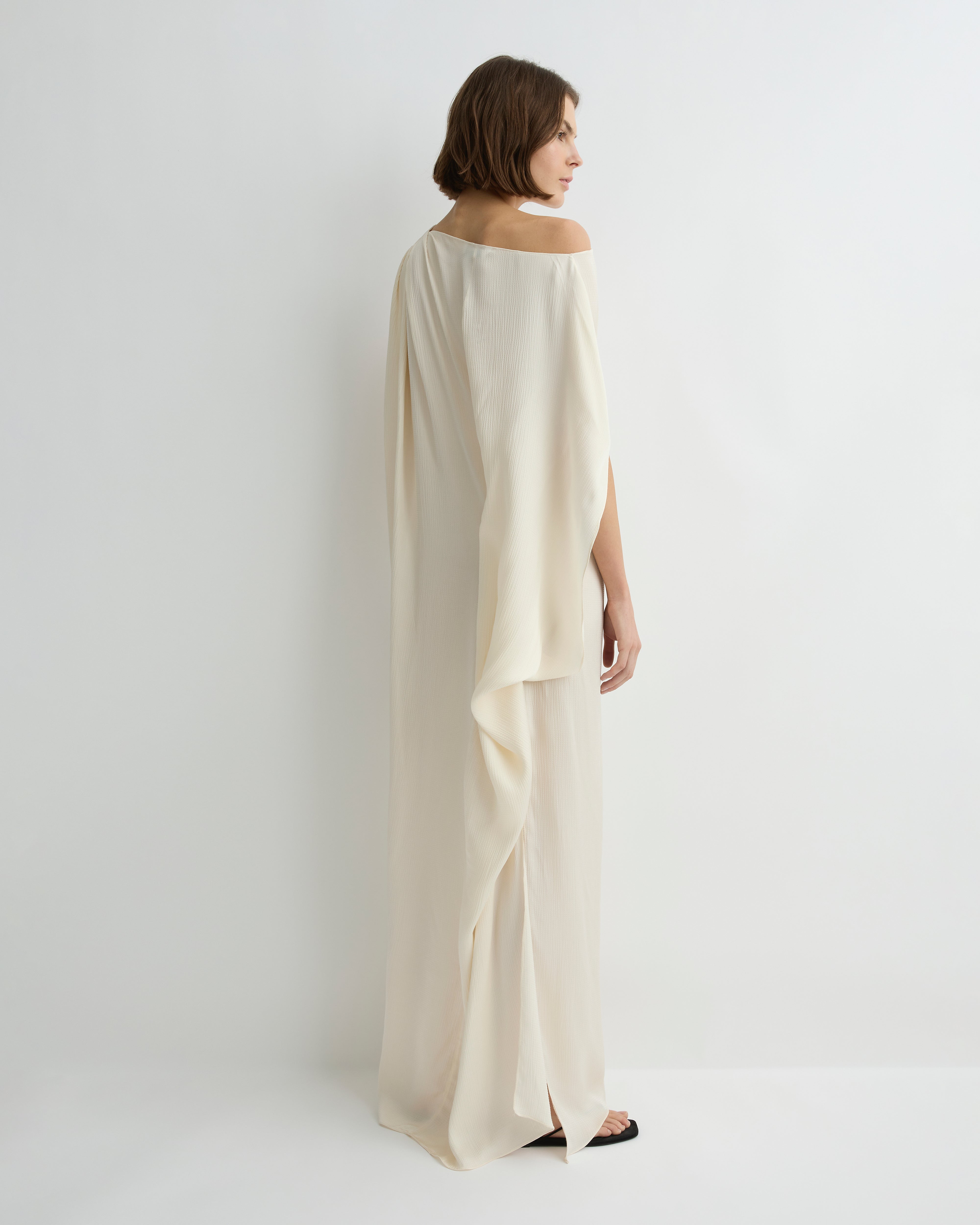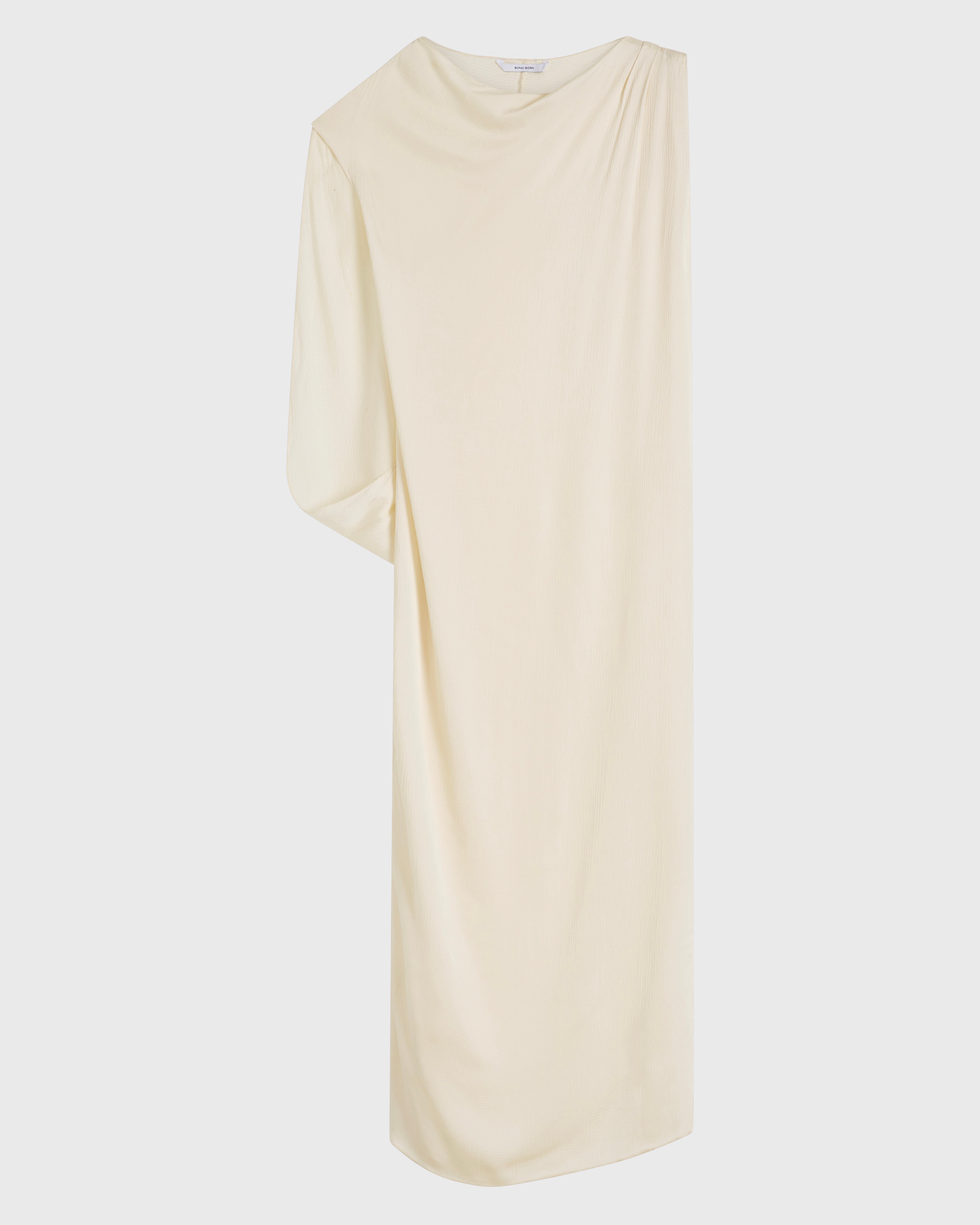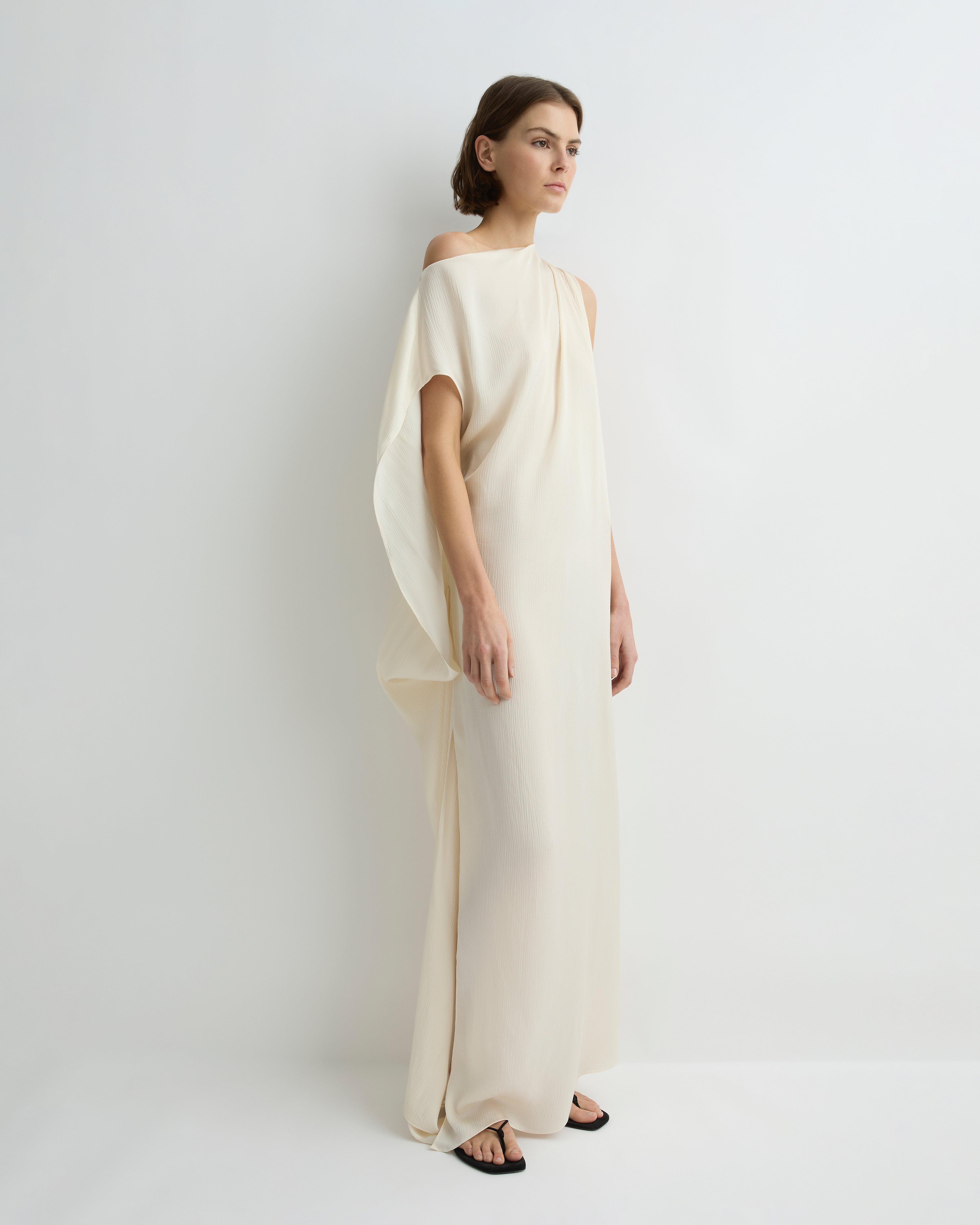 Cut from luxurious European Hammered Satin, the Ardea Asymmetric Maxi Dress in pearl brings sculptural elegance to warm-weather dressing. Its wide high neckline, asymmetric shoulder tucks and draped armhole create effortless movement and a modern, fluid silhouette. Relaxed through the body with a full-length fall, this piece embodies understated glamour.