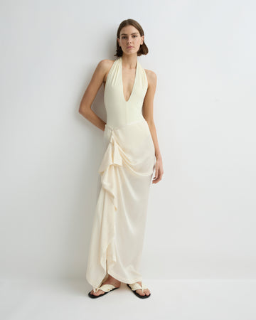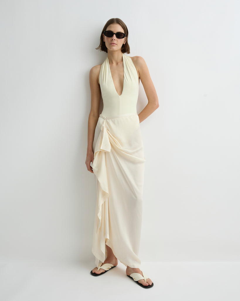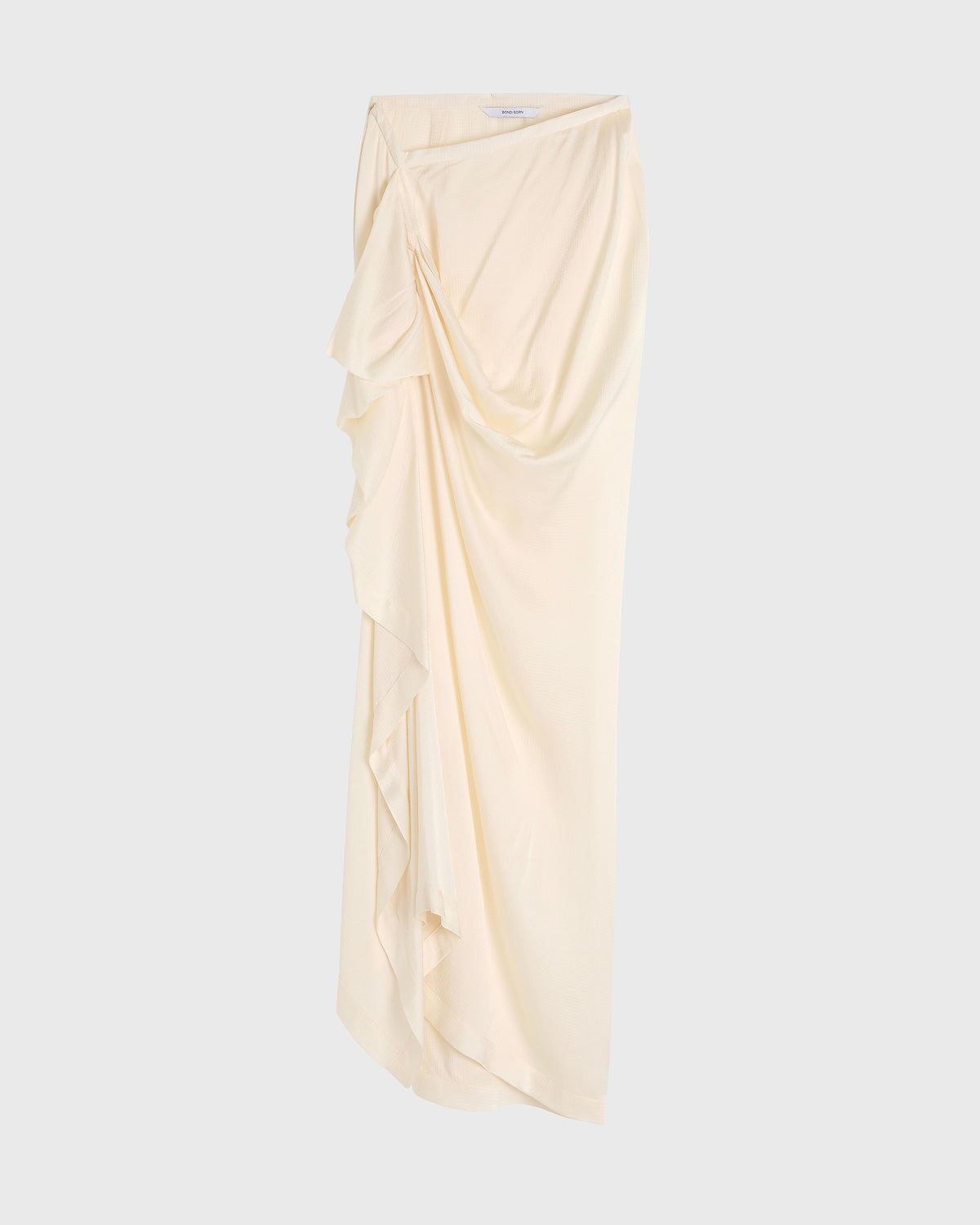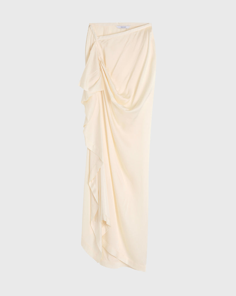 A modern take on timeless elegance, the Ardea Draped Skirt in Pearl is cut from a lustrous European hammered satin crafted in a fluid viscose blend. The fixed wrap front creates soft draping through the body, while the invisible side zip ensures a clean, refined finish. Slim through the waist and hips, it falls into a long, fluid line that elongates the silhouette and carries you perfectly into elegant evenings.
