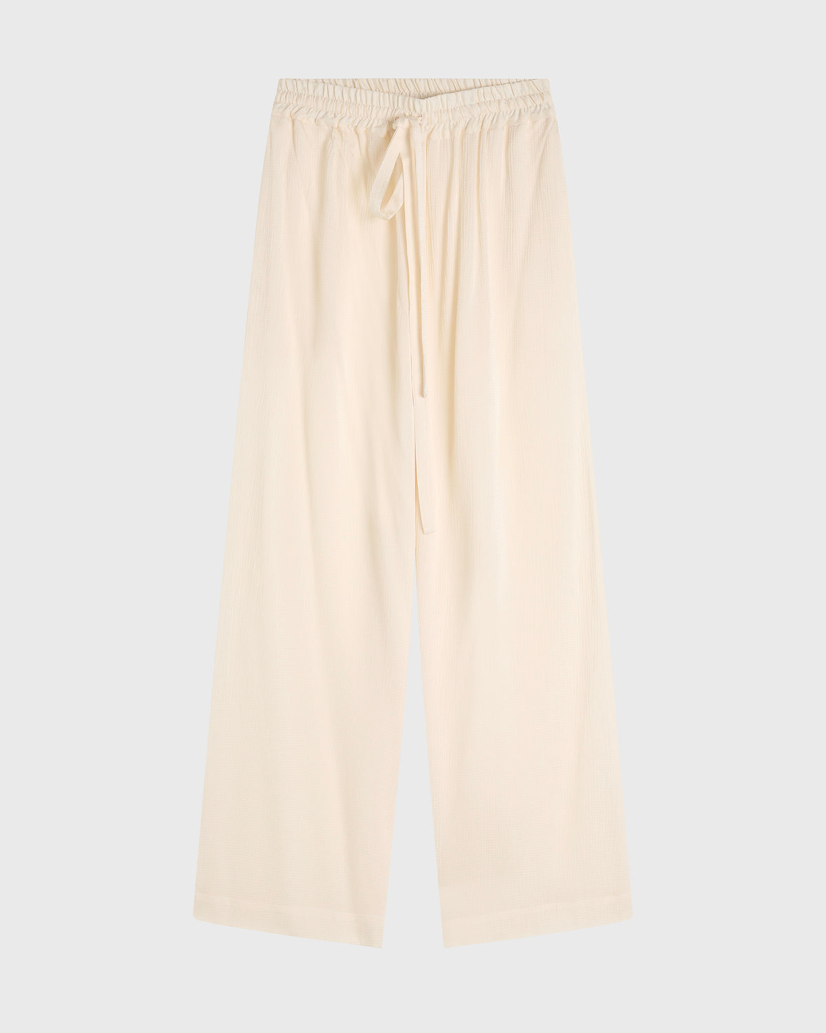 Effortlessly refined, the Ardea Luxe Pant in Pearl is cut from a fluid viscose blend with a luminous European hammered satin finish. Designed with a wide elasticated waistband and self-tie detail, this relaxed silhouette flows into a wide leg that moves gracefully with the body. Side seam pockets lend ease and versatility, while its draped leg balances comfort and polish.