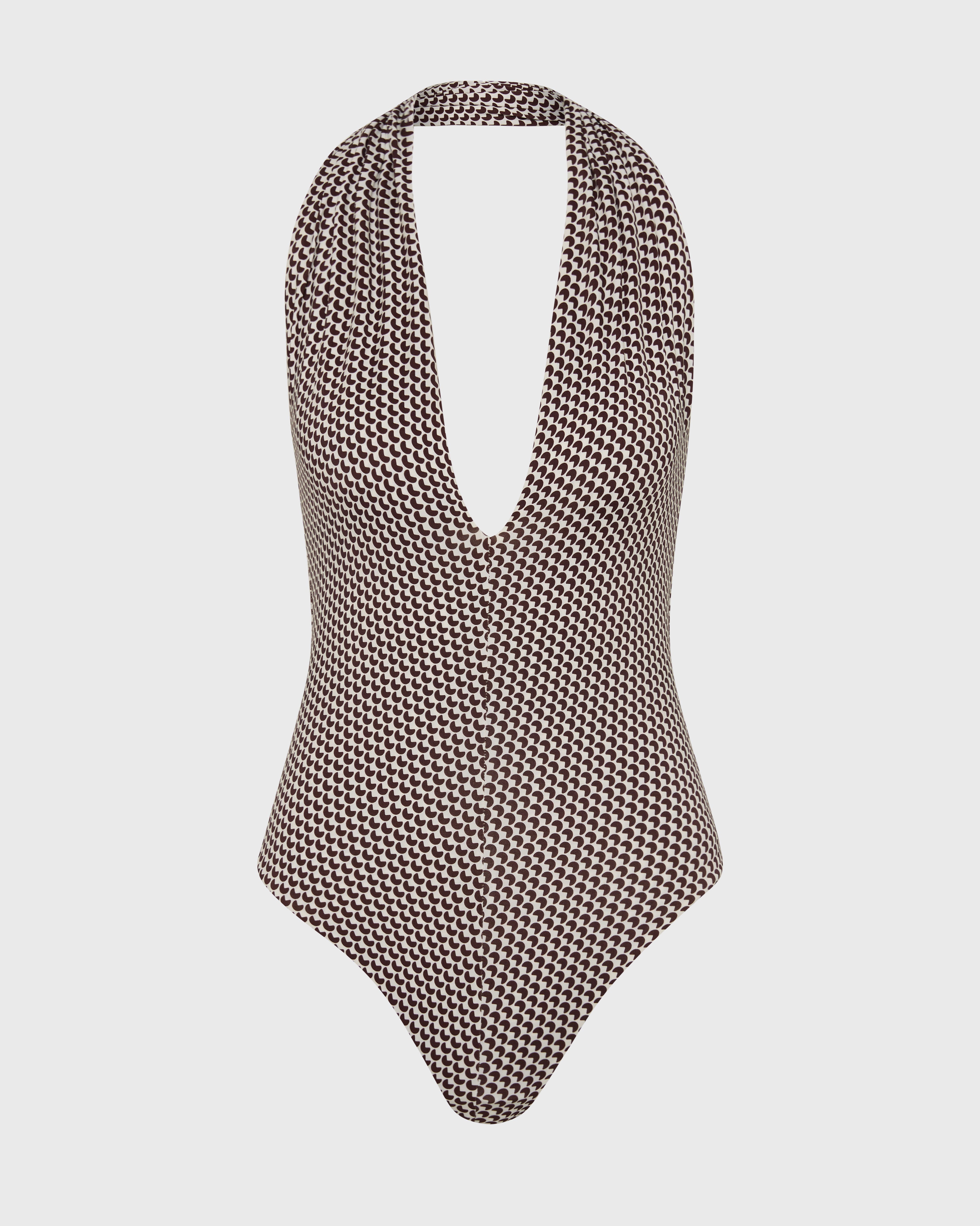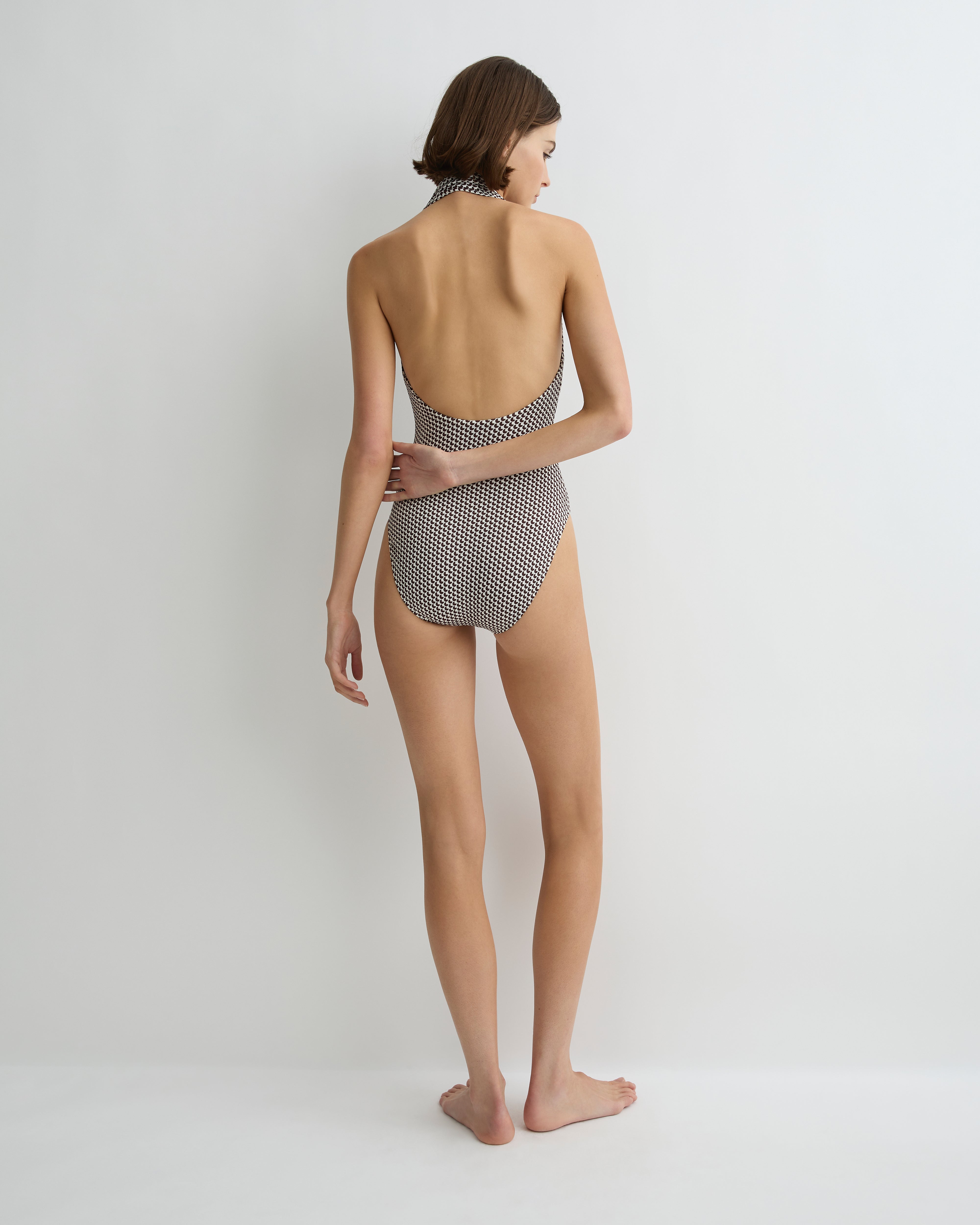 The Blair One Piece in mocha dot is a sleek halter neck swimsuit, cut from our luxurious Italian Embodee™ fabric with gentle shaping power. Defined by its plunging V neckline and wide halter straps that gather softly when worn, this minimalist silhouette flatters the décolletage with ease. Self-lined and designed without cups for a smooth finish, Blair offers comfort, confidence and a second-skin fit. The fabric is breathable, quick drying and resistant to chlorine and pilling.