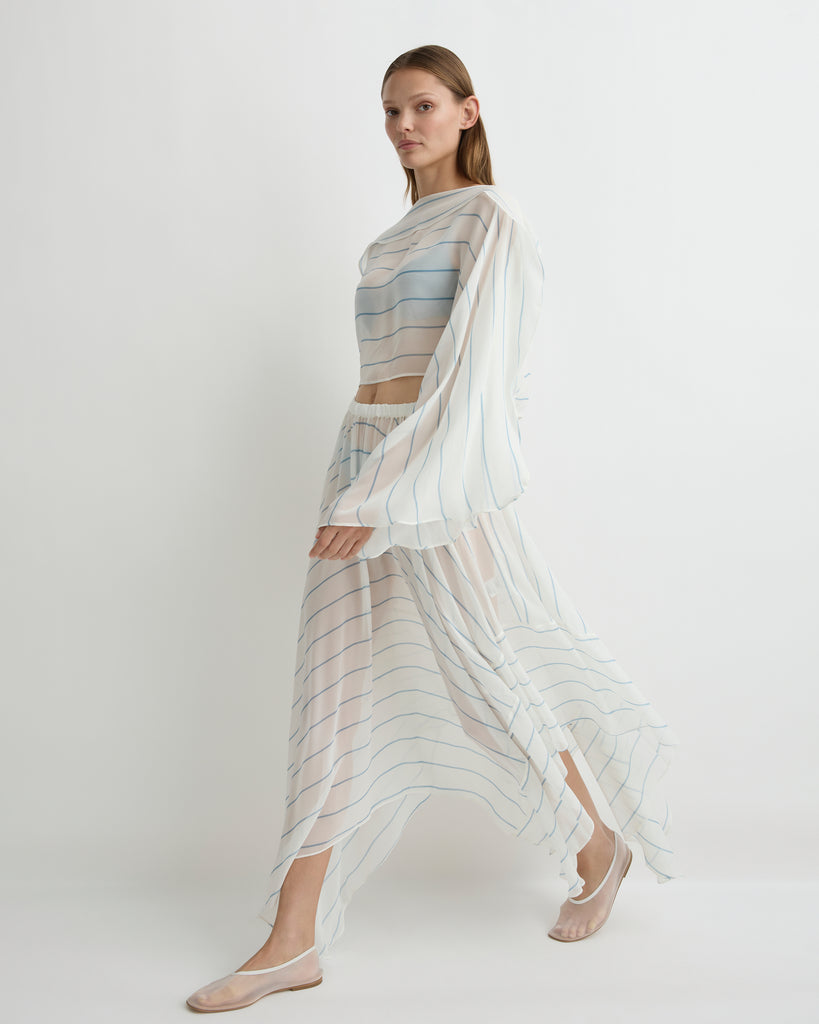 The Capri Silk Kimono Top in Smoke Stripe is a statement piece with a fluid, feminine drape, cut from 100% silk. Relaxed kimono sleeves fall softly from the shoulder, while ruffle detailing traces the neckline and outer arms for a touch of drama. Layered over a removable camisole slip with adjustable straps, it offers styling versatility to move effortlessly from elevated daywear to refined summer evenings. Pair with our Capri Silk Square Skirt in Smoke Stripe for the perfect resortwear co-ord.