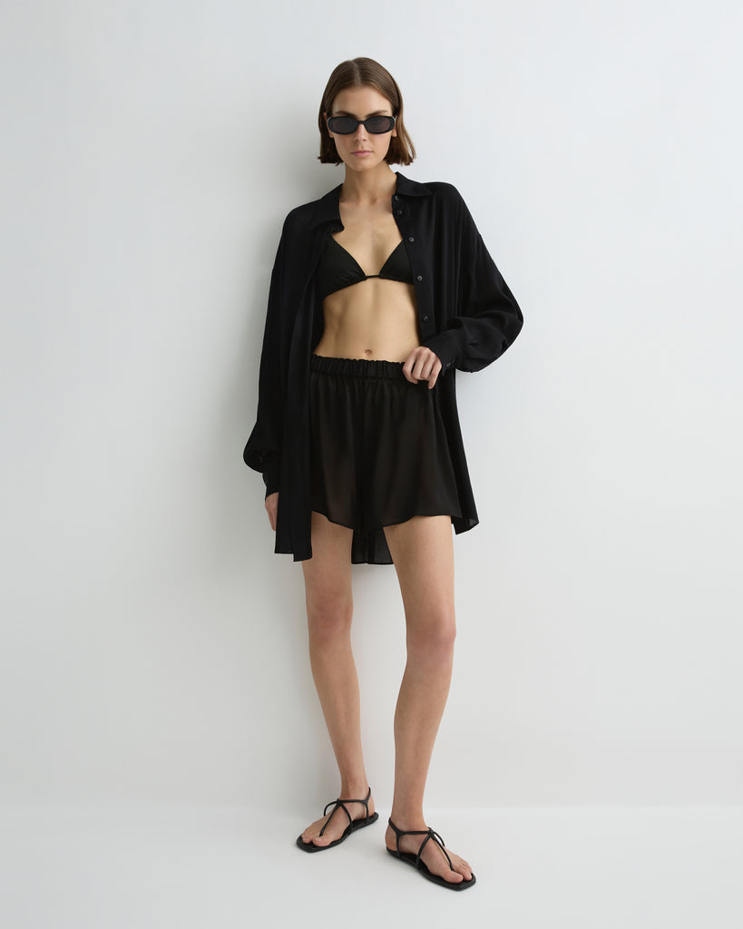 The Cremona Short in Black are a lightweight summer staple, crafted from soft, sheer European rayon voile. Designed with an elasticated waistband and relaxed fit through the leg, they offer comfort and ease for warm-weather dressing. Perfect worn over swimwear or styled with the matching Cremona Oversized Shirt, they bring effortless versatility to resort wear.