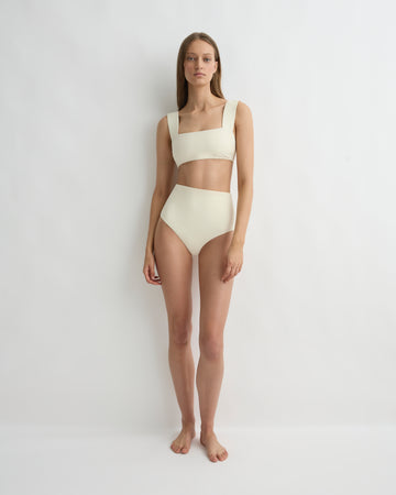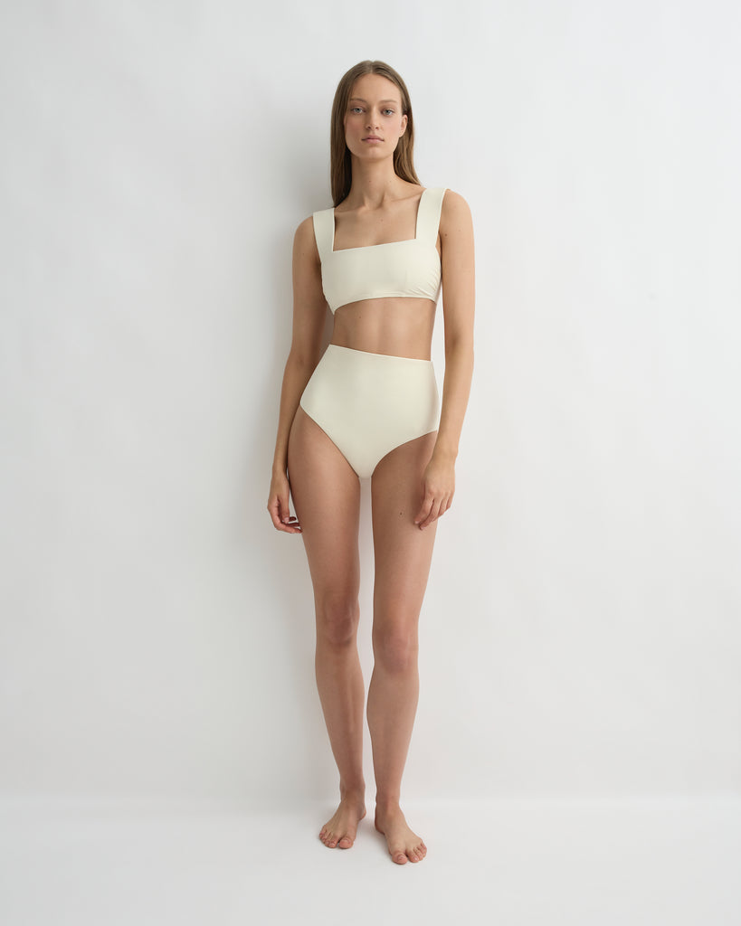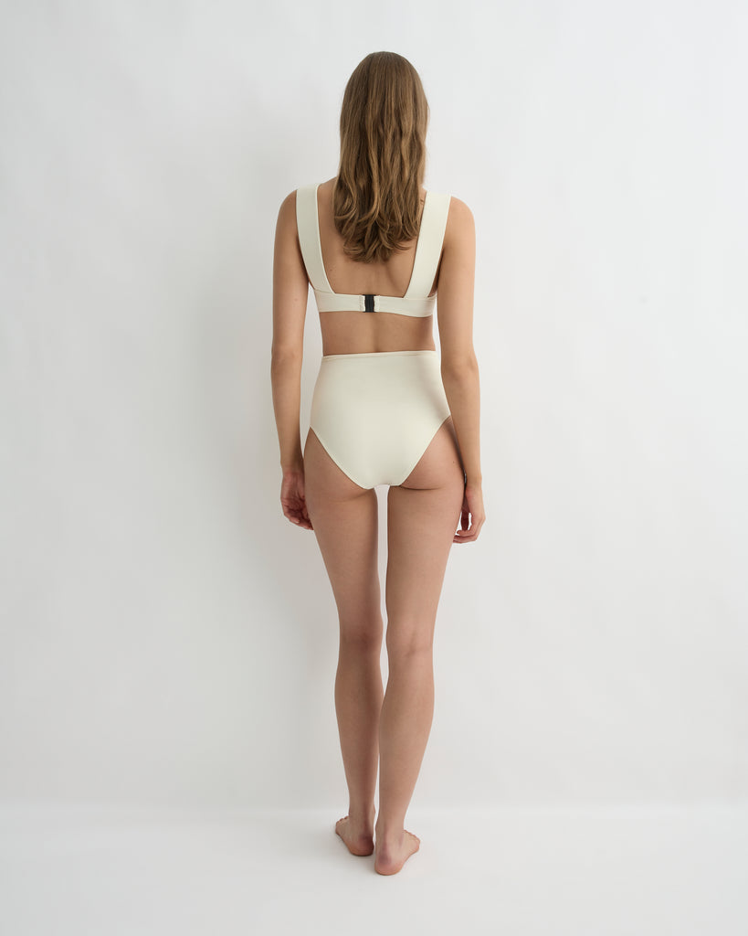 The Elle Bikini Top in Pearl is a minimal square neck design featuring extra-wide elasticated shoulder straps, gathers at the side bust to shape the bust, invisible under-bust support, removable cups and a branded back clip. Elle is made using our technically advanced Sculpteur® fabric that flatters and supports the bust. Suitable for large bust sizes up to DD.