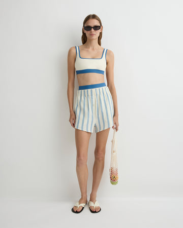 The Finn Short in Dusk Stripe are a relaxed summer essential, crafted from lightweight crinkle stretch cotton woven in Portugal. Sitting on an elasticated waistband, the design features side pockets and a faux fly with button detail. Relaxed through the leg, they offer ease and versatility for warm-weather dressing. Style with our Finn Wrap Tunic for an effortlessly coordinated look.