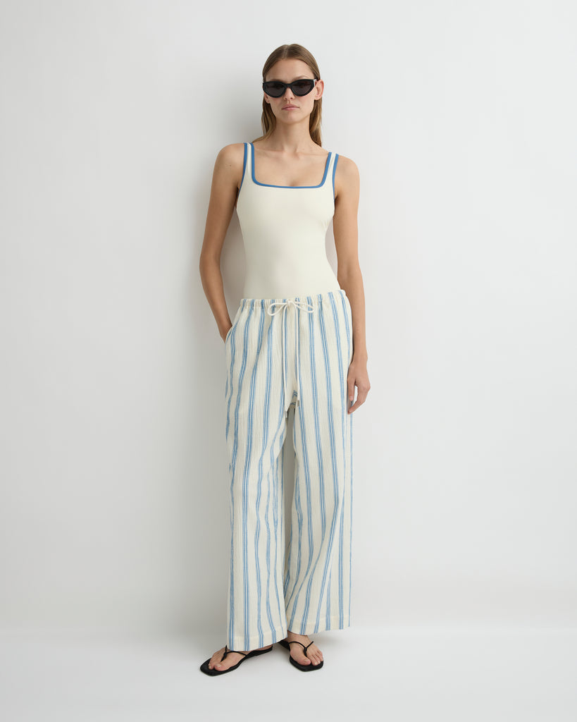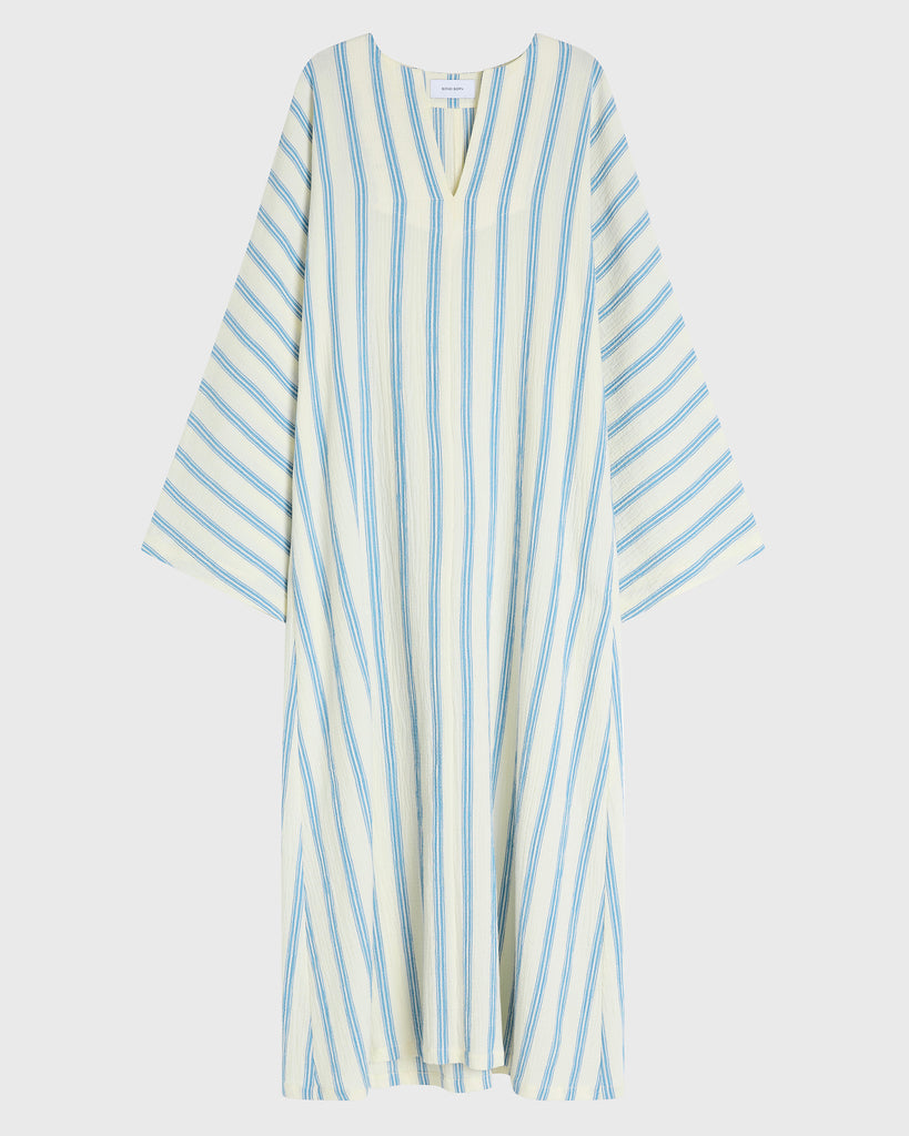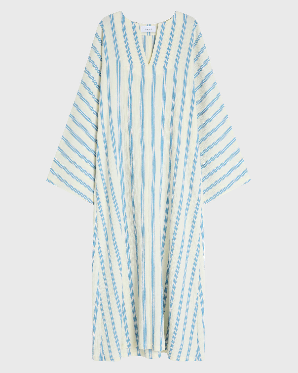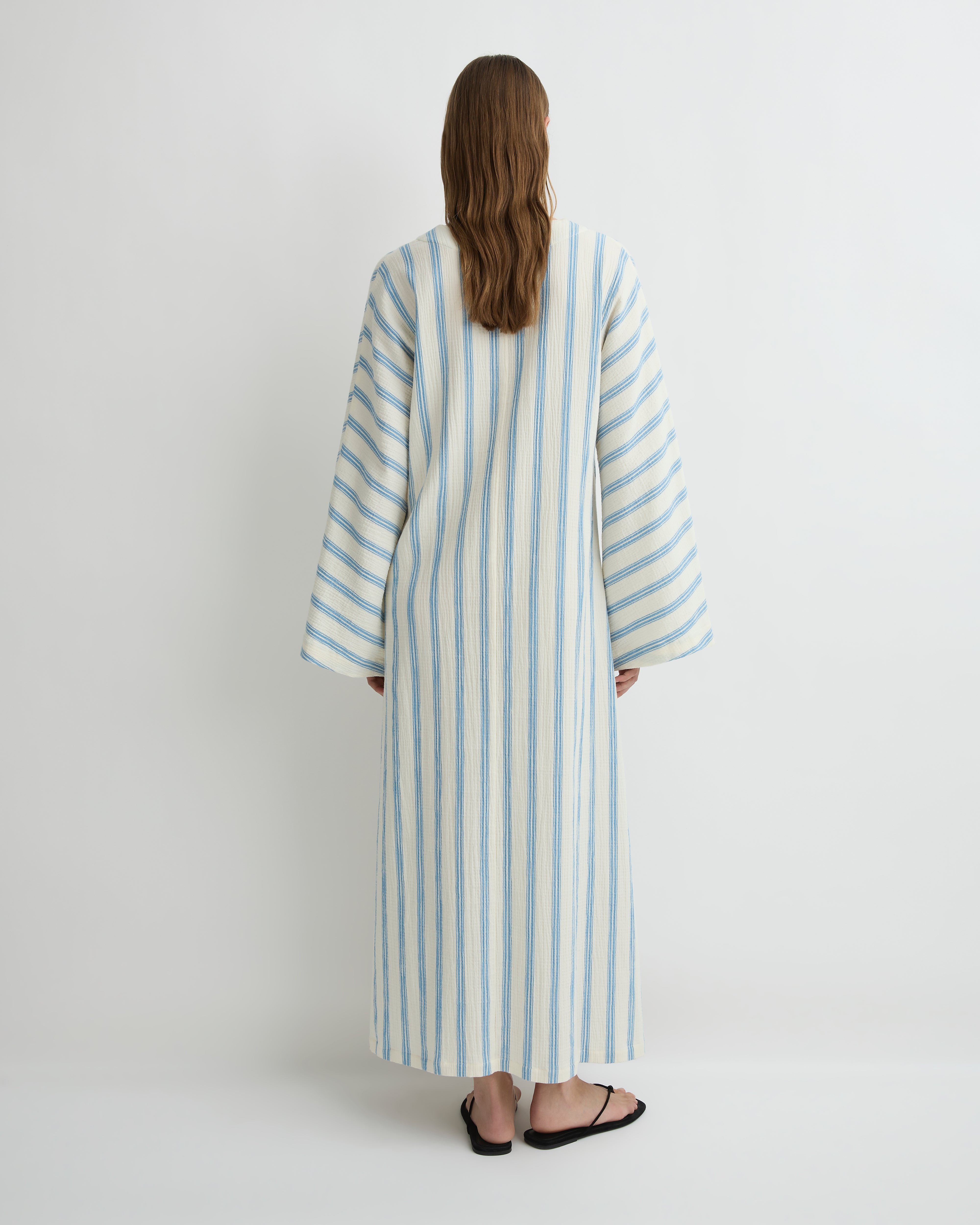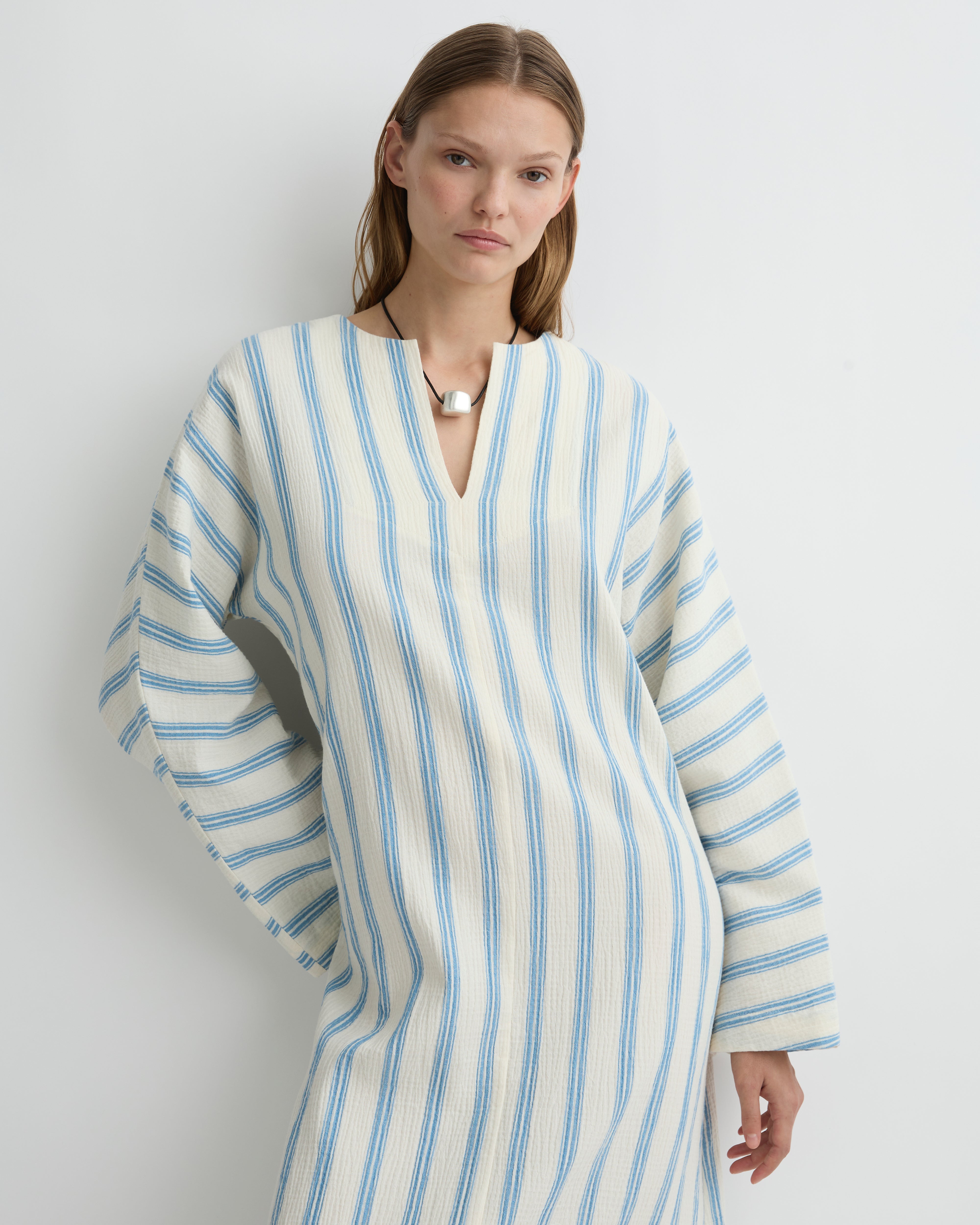 The Finn Throw-Over Tunic in Dusk Stripe is a relaxed summer essential, crafted from lightweight crinkle stretch cotton woven in Portugal. Designed with an oversized kimono sleeve and a softly flared silhouette, this pull-on style falls to a maxi length for ease and elegance. Cut for a relaxed fit through the body, it is the perfect piece to slip over swimwear for elevated yet effortless resort dressing.
