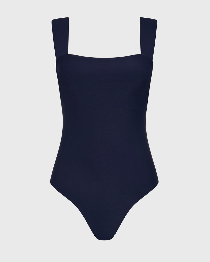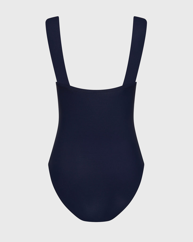 One of our all-time best selling cuts, the Gwen One Piece in Navy features a minimal square neckline, wide comfortable straps, invisible under-bust support, removable cups and flattering gathers at the side bust. Gwen is made using our technically advanced Sculpteur® fabric that flatters and supports the silhouette. Gwen offers regular bottom coverage, firm tummy control and ample support for bust sizes up to DD+. Gwen features internal openings compatible with mastectomy cup inserts.