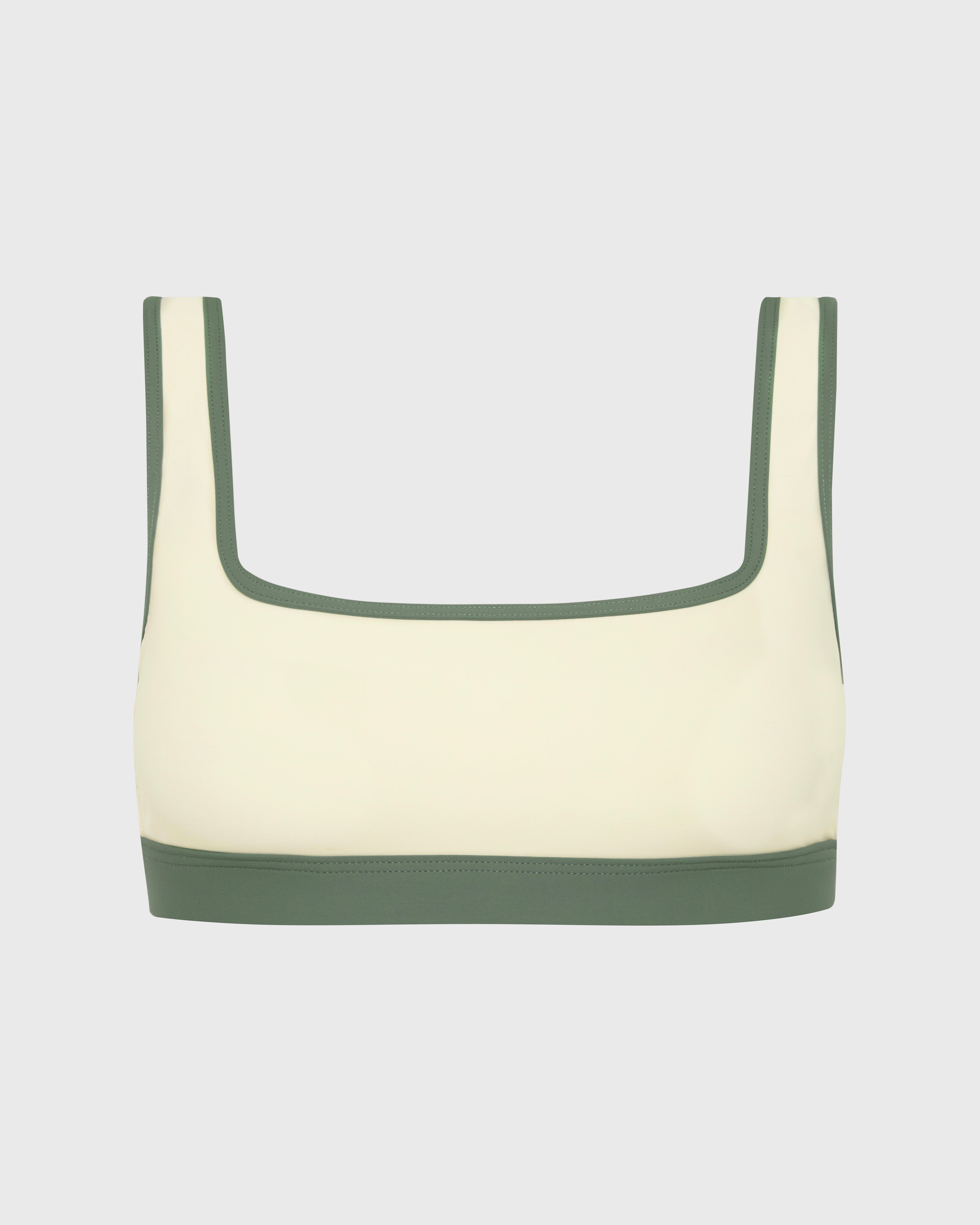 The Hayden Bikini Top in sage contrast has a chic, classic square neck that features contrasting bind in refined Dusk. Hayden is made using our technically advanced Sculpteur® fabric with 3-D stretch, that supports the bust. The bikini top features invisible under-bust support. The back has a V line and a branded clip. Style Hayden with our matching Jayde Bikini Bottom in Pearl & Dusk.