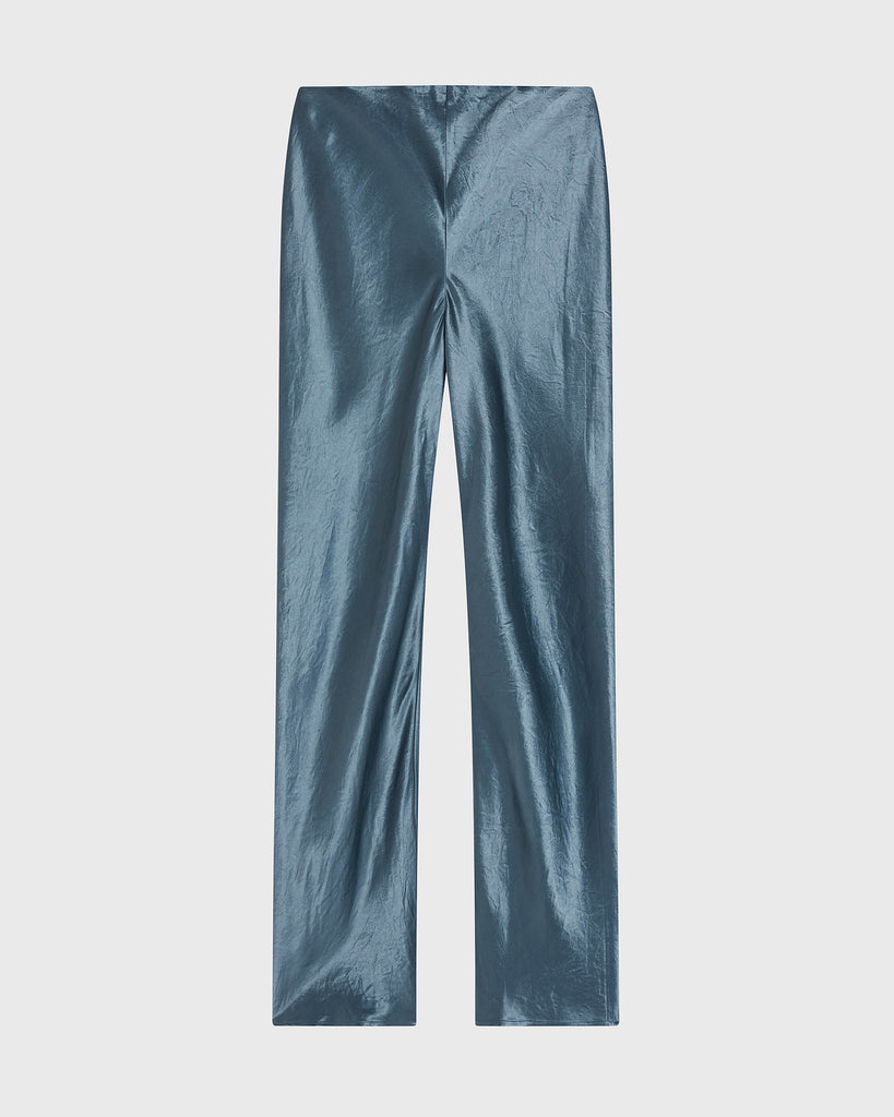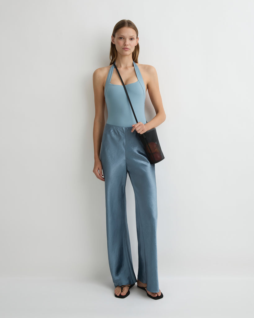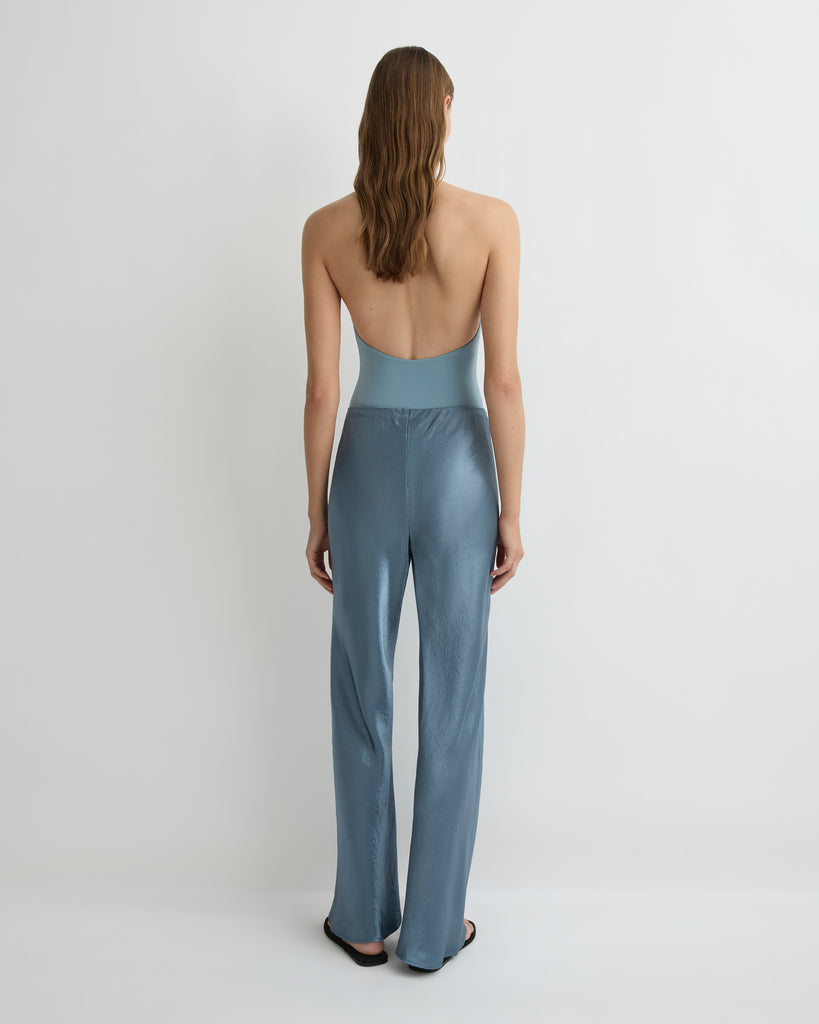 The Kobe Bias Pant in Steel Blue is a refined resort staple, crafted from Japanese Naia™ acetate satin with a subtle sheen. Cut on the bias for a fluid drape, this wide-leg silhouette features a hidden elastic waistband for ease and comfort. Falling to full length, the pant offers a flexible fit and elongating line. Pair under our matching Kobe Mini Slip Dress for an elevated, statement resort look.
