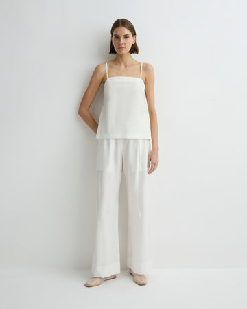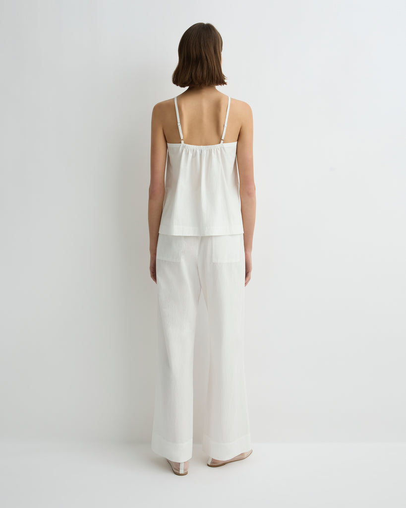 The Kyoto Cami in White is a refined warm-weather staple, crafted from crisp Japanese dry cotton poplin. This minimalist silhouette features a straight neckline, slender adjustable straps and side splits, with elastic at the back for a comfortable fit. Effortlessly versatile, it pairs seamlessly with our matching Kyoto Pant or Kyoto Short.
