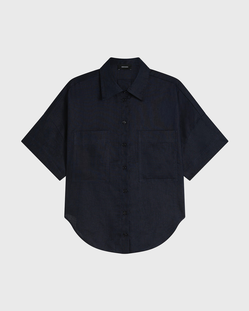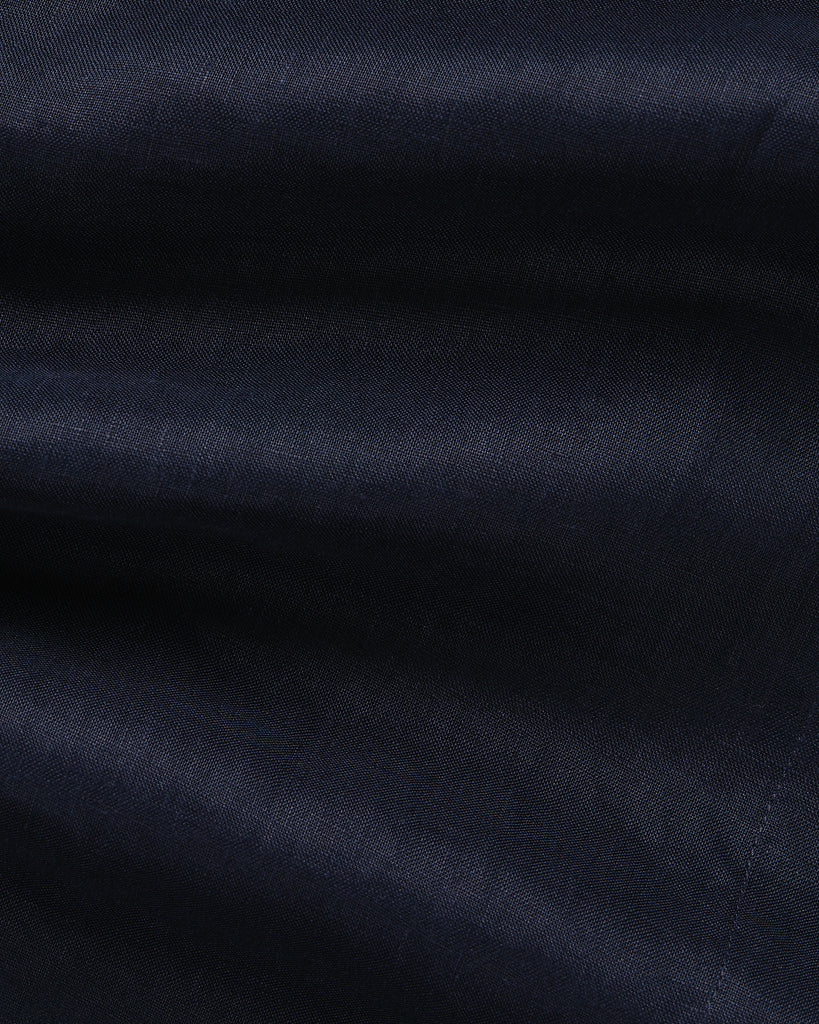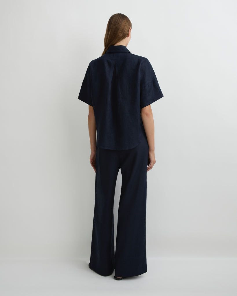 The Leiden Short Sleeve Shirt in Navy is a modern wardrobe staple, cut from lightweight linen repurposed from deadstock fabrics. This relaxed, boxy silhouette features a classic collar, button-front closure and shaped hem, finished with chest pockets and sustainably sourced Japanese buttons made from plant-derived material. Versatile and timeless, it can be styled with our matching Leiden Short in Navy for a chic, coordinated look.