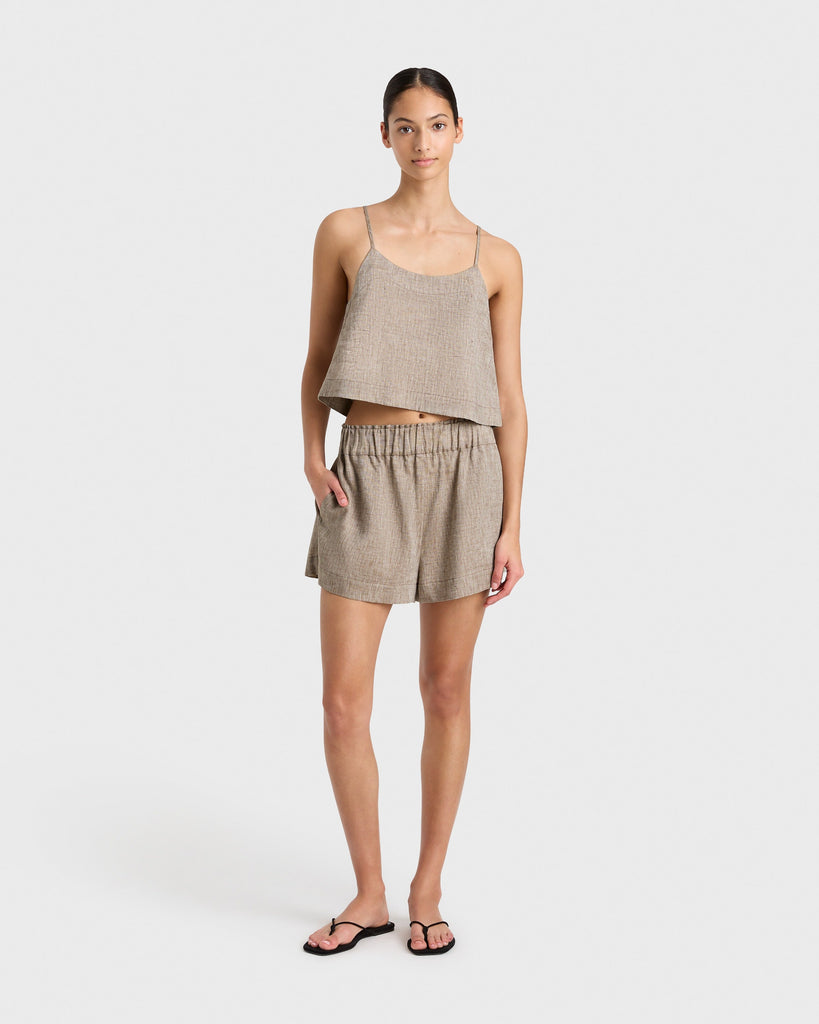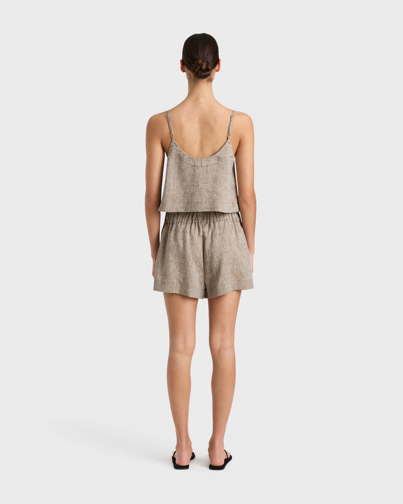 The Leiden Universal Cami in Sepia is a versatile warm-weather staple, crafted from crisp, lightweight organic linen milled by a Masters of Linen™ using European Flax. Designed with adjustable shoe-string straps and a slightly flared silhouette, this elegant top falls just at the hips, making it perfect for layering. Pair it with the matching Leiden Universal Pant or Short for an effortless summer set.