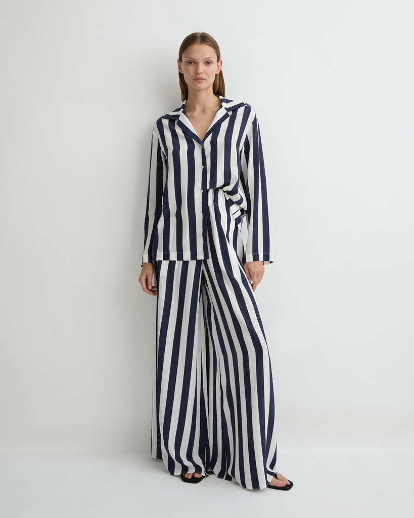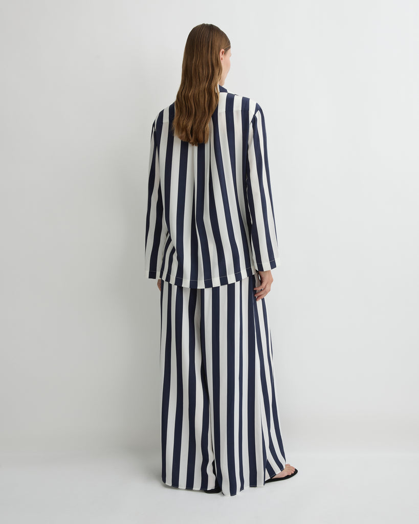The Orta Silk Palazzo Pant in Navy Stripe makes for a relaxed yet elegant silhouette. Crafted from luxurious, lightweight 100% Silk crêpe de Chine, featuring an elasticated waistband with pockets and adjustable drawstring ties, these flowing pants are perfect for pairing with the co-ordinating Orta Silk Long Sleeve Blouse or Tank Top.