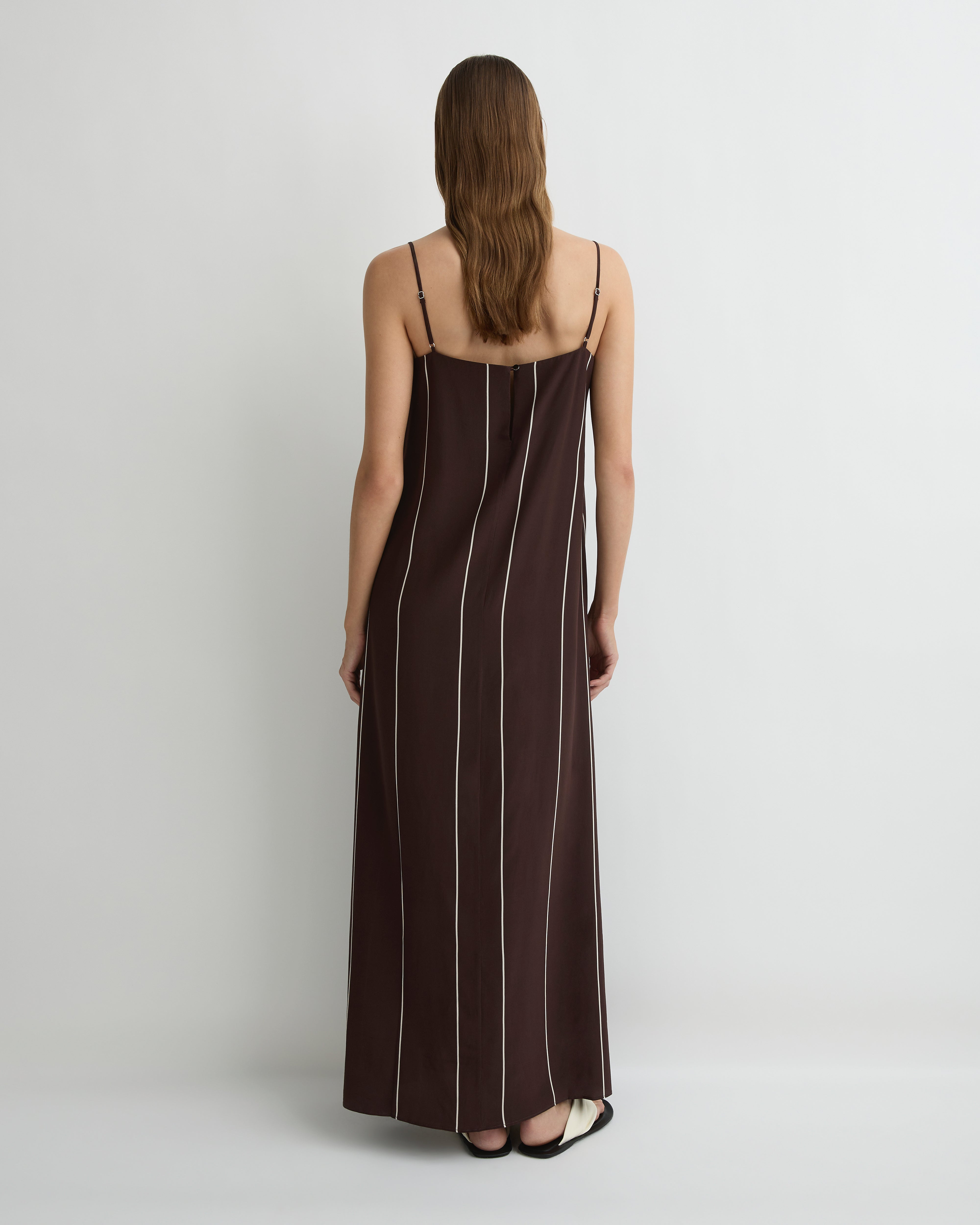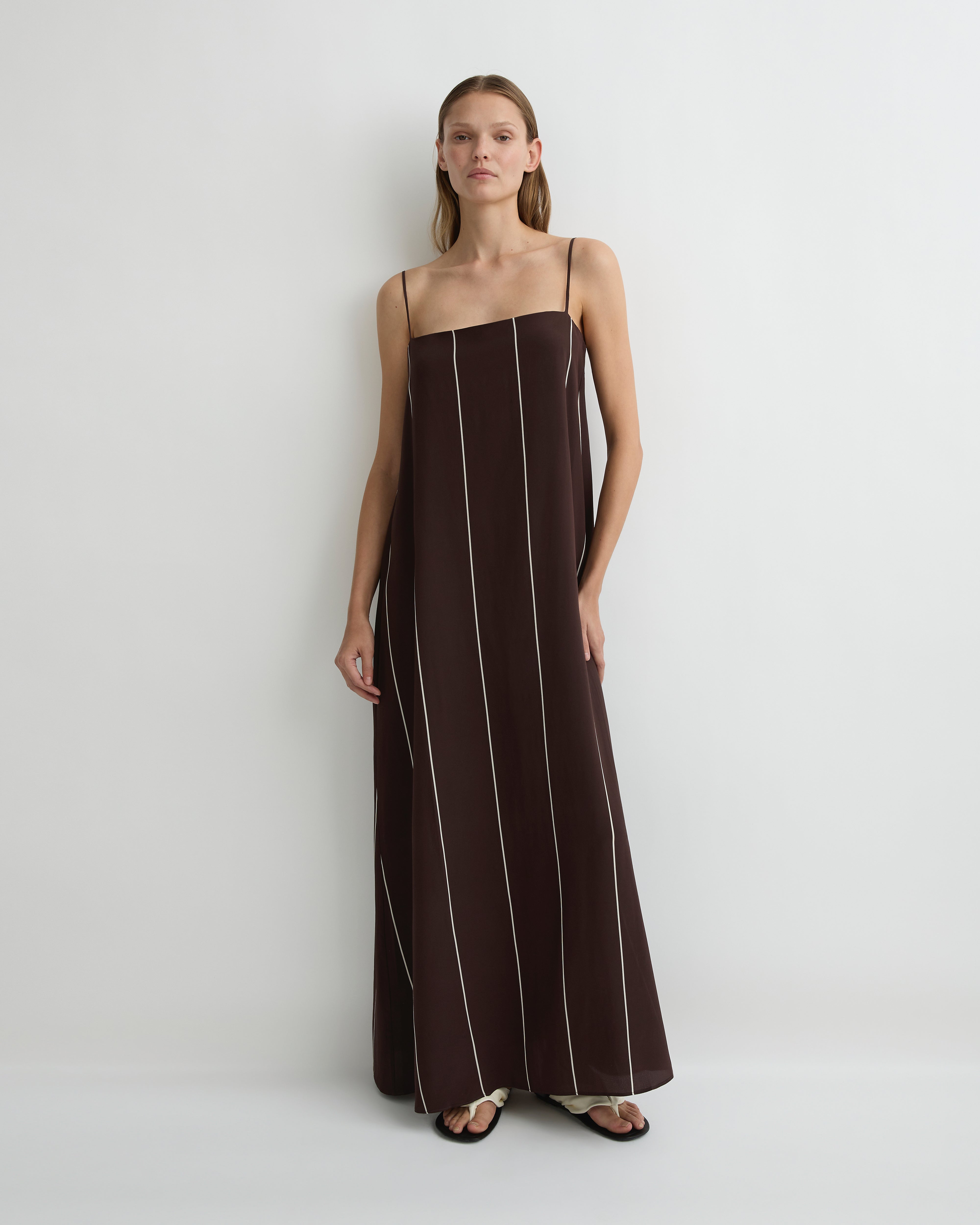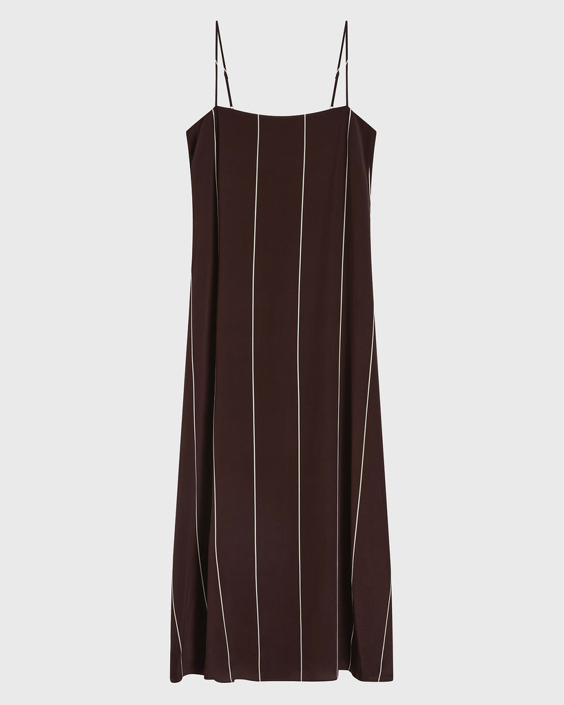 The Orta Silk Slip Dress in Mocha Stripe is a refined resort silhouette, cut from 100% silk crêpe de Chine with a soft, fluid drape. This A-line design features a trapeze shape that falls into a lightly flared body, suspended from fine rouleau straps and finished with a single gunmetal shank button at the back. Effortless and versatile, it can be styled for day or elevated for evenings.