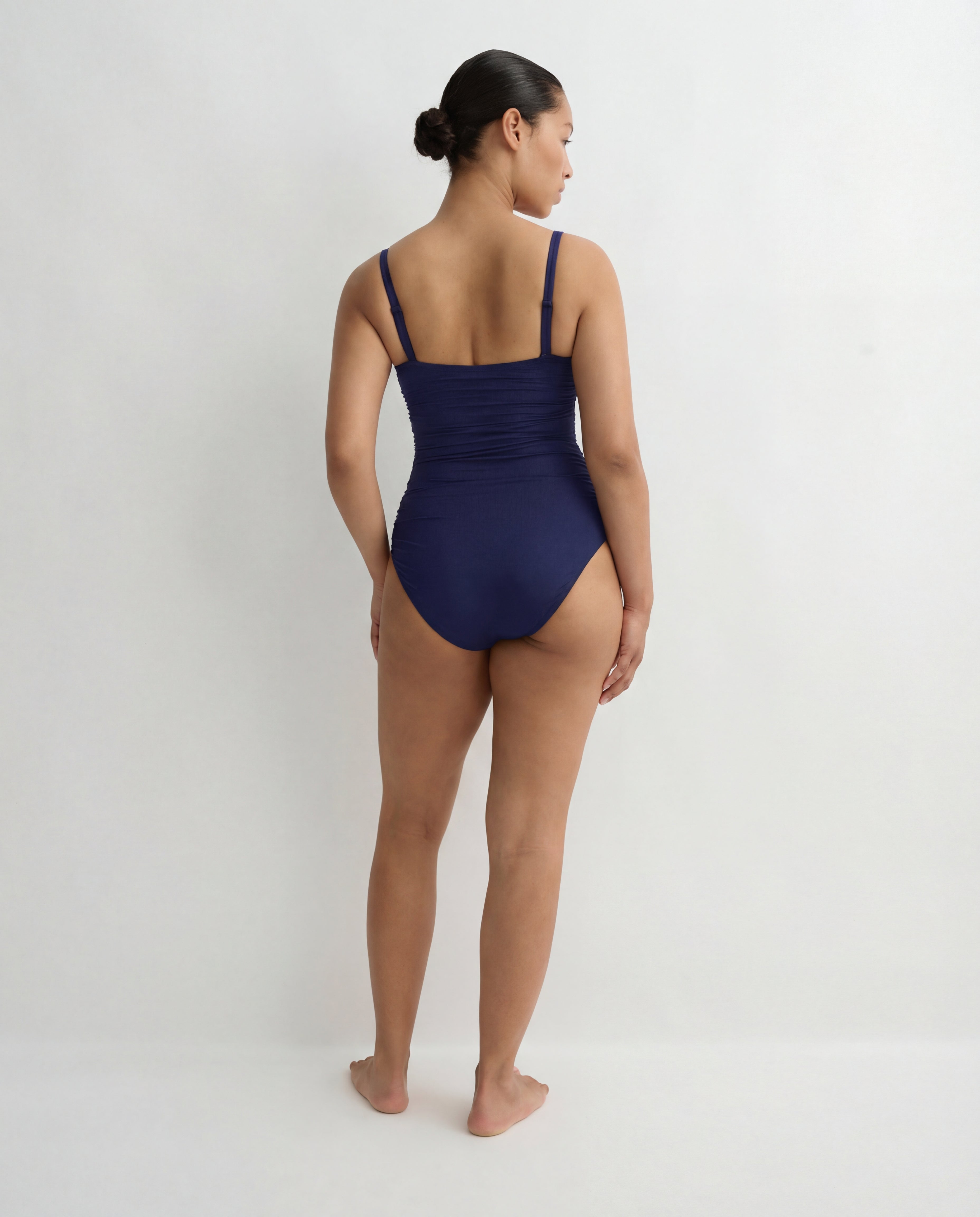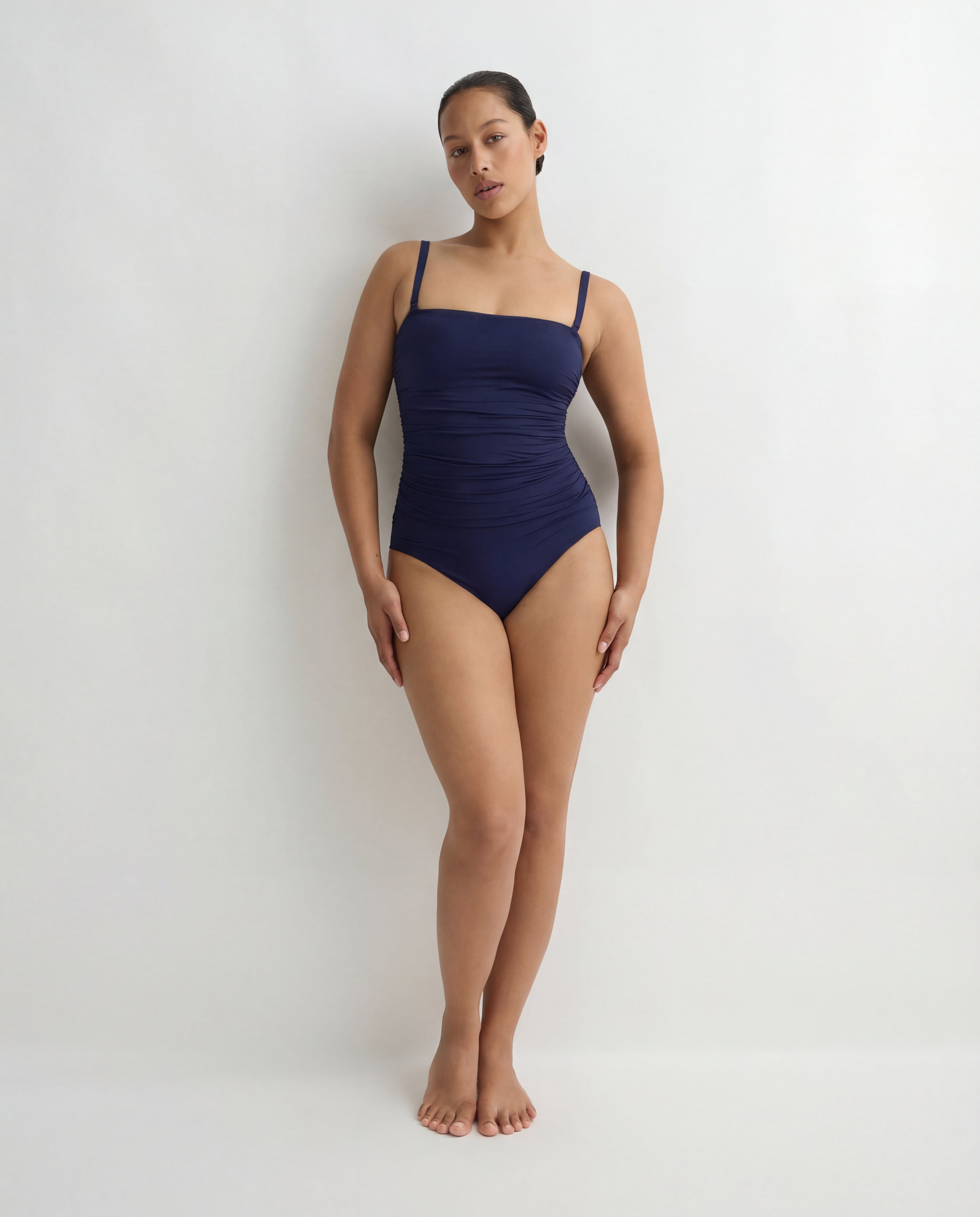 The Raya Bandeau One Piece in Maritime iis a timeless swimwear silhouette designed for both comfort and confidence. Crafted from our ultra soft, Italian Embodee™ fabric with gentle shaping power, Raya features gathers across the stomach to flatter the silhouette. Invisible under bust support and detachable straps offer versatile styling. Ideal for larger bust sizes from C to F, Raya is a timeless piece for your summer wardrobe. This sustainably produced luxury fabric will last up to ten times longer than standard swim fabrics.